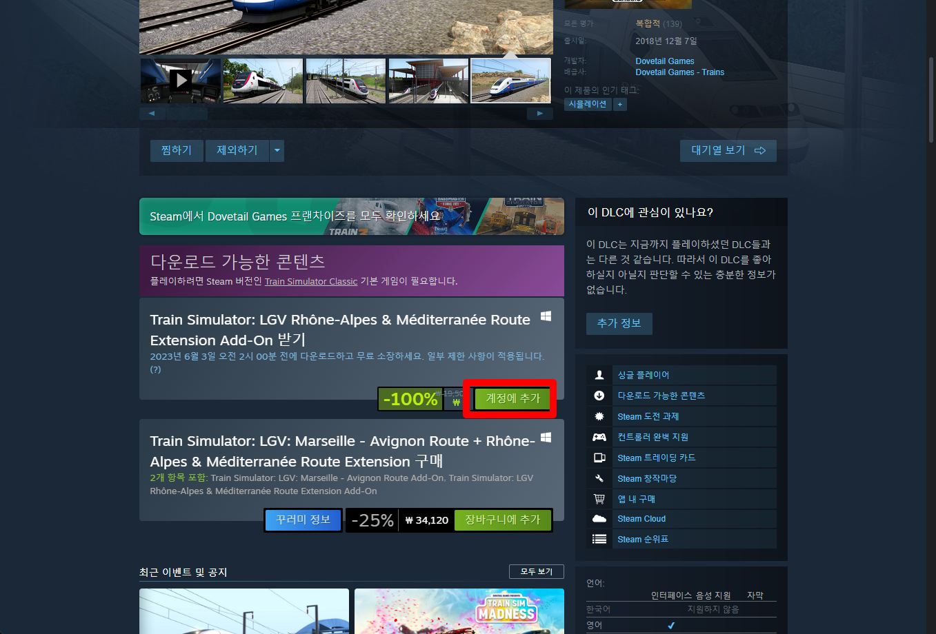 "Train Simulator: LGV Rhône-Alpes & Méditerranée Route Extension Add-On" 게임페이지를 조금 내려준 후 [계정에 추가] 버튼을 클릭하면 게임라이브러리에 추가됩니다.