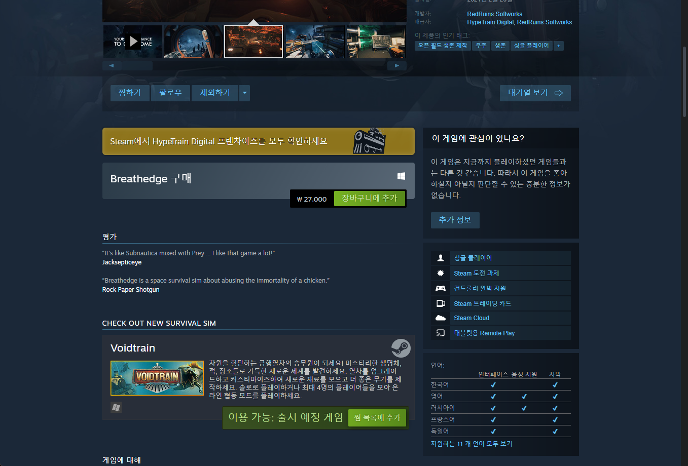 ₩27,000 -> ₩0(FREE) Breathedge 브레스엣지 무료로 받기 영구소장; 에픽 게임즈 epic games EGS 한시적 무료 Get free copy