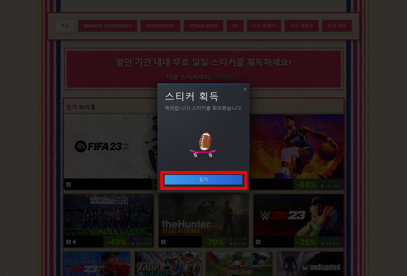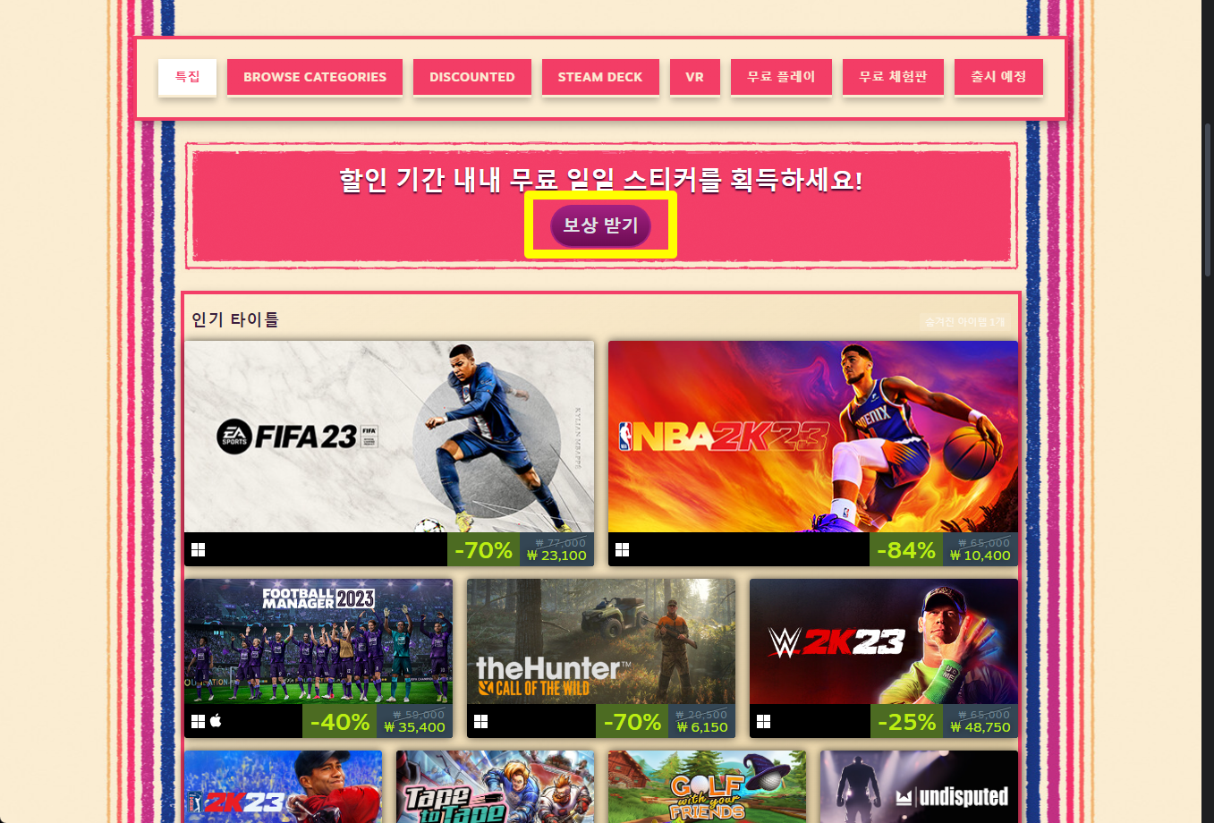 "Sports Sales Steam Stickers" 게임페이지 조금내려서서 [보상받기] 버튼을 클릭합니다.