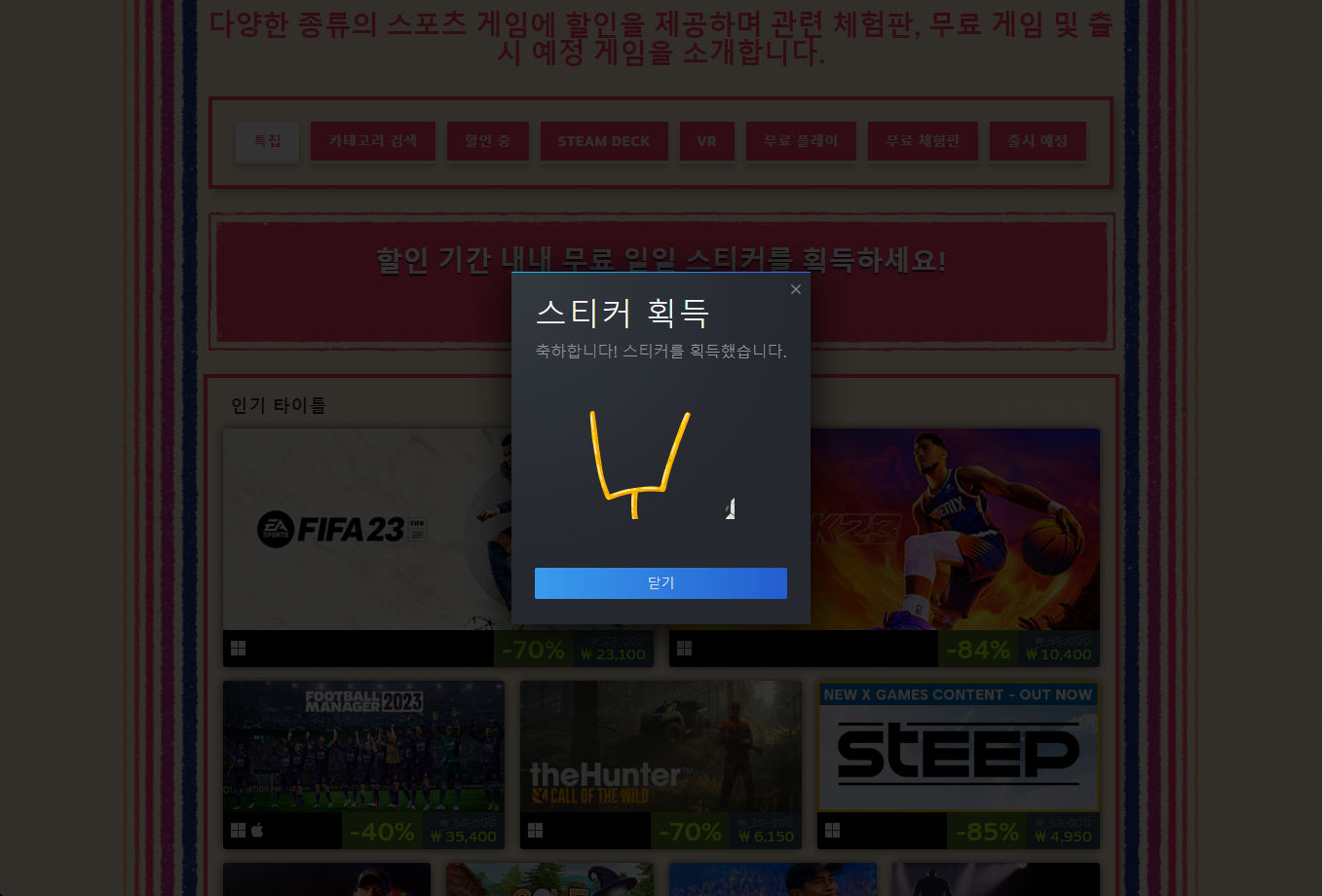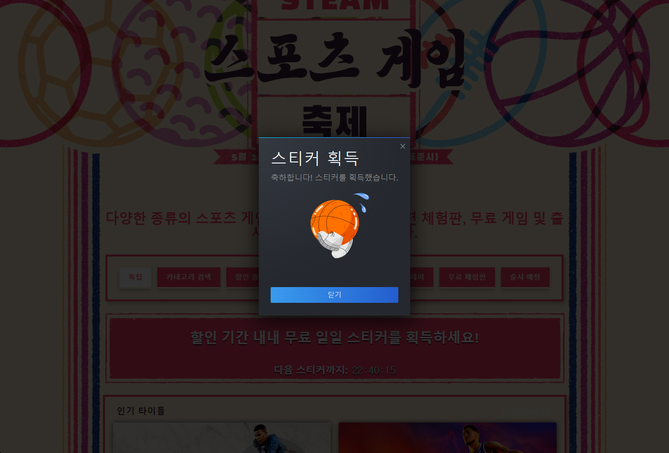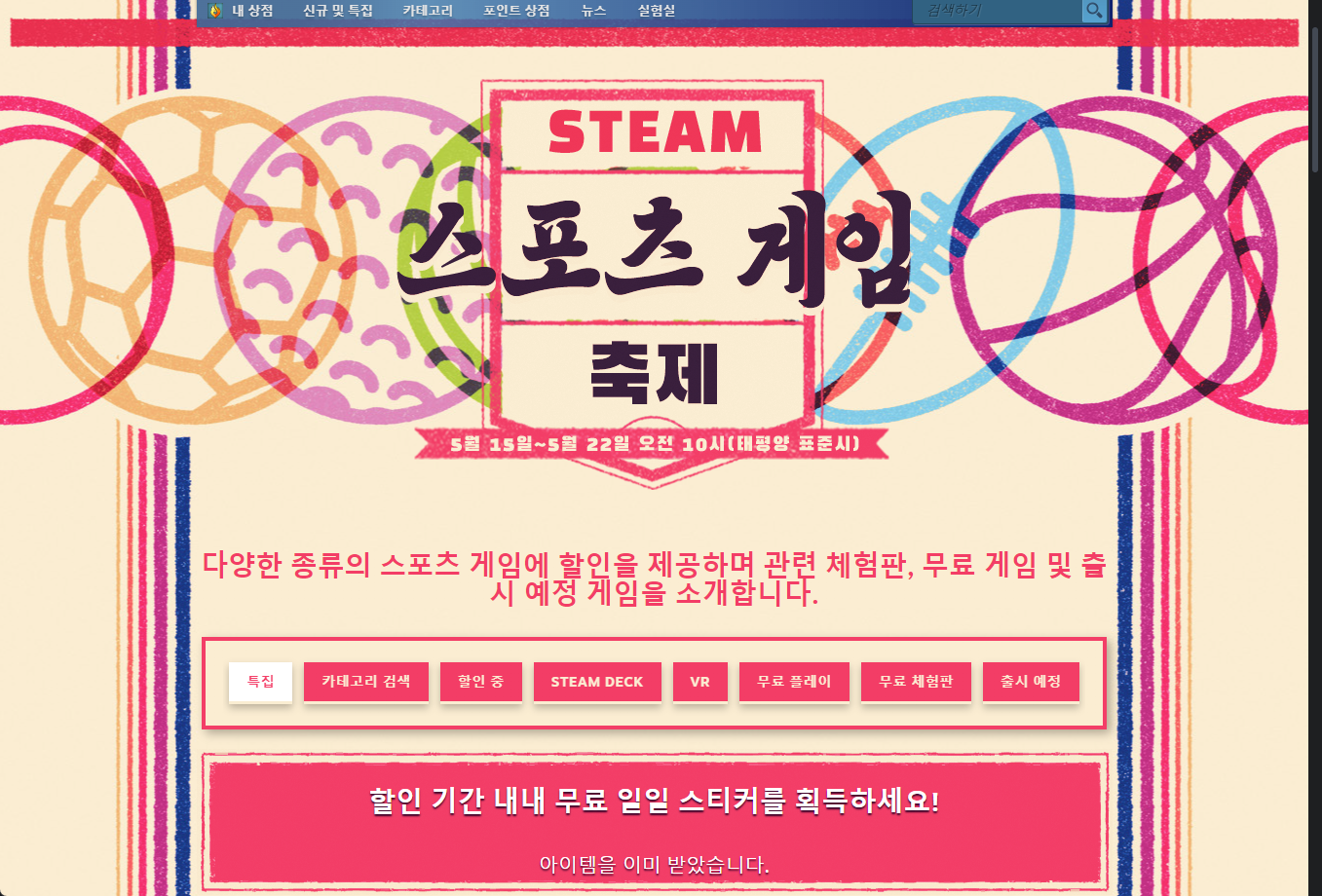 ₩0(FREE) Sports Sales Steam Stickers Sports Sales Steam Stickers 스포츠 게임 세일 무료 일일 스티커 무료 소장하기; 스팀 Steam 한시적 무료 Get free copy