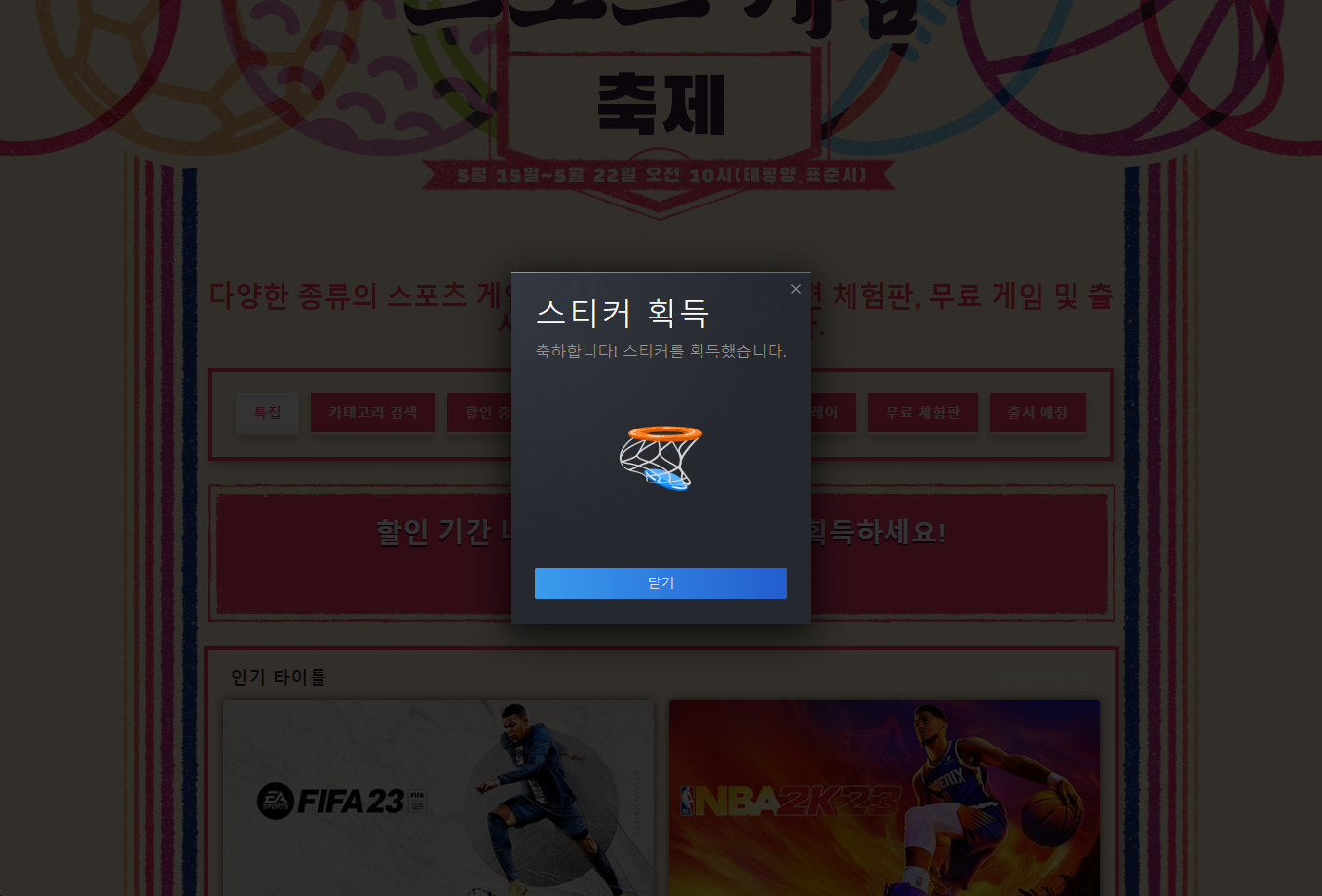 스티커 받았습니다. [닫기] 클릭해서 팝업창 닫아줍니다.