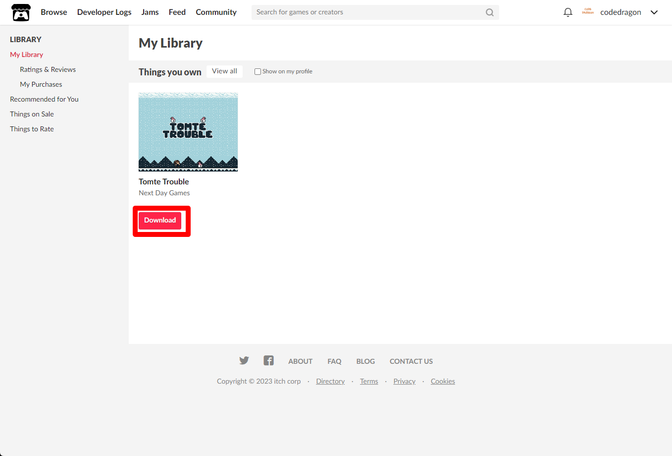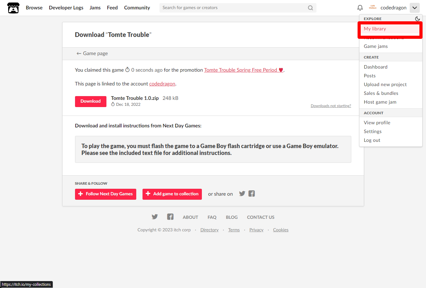 itch.io에서 받은 "Tomte Trouble" 게임 확인하고 설치파일 다운받아 보겠습니다. 우측 상단의 나의 사용자명 오른쪽의 화살표 아이콘을 클릭합니다.