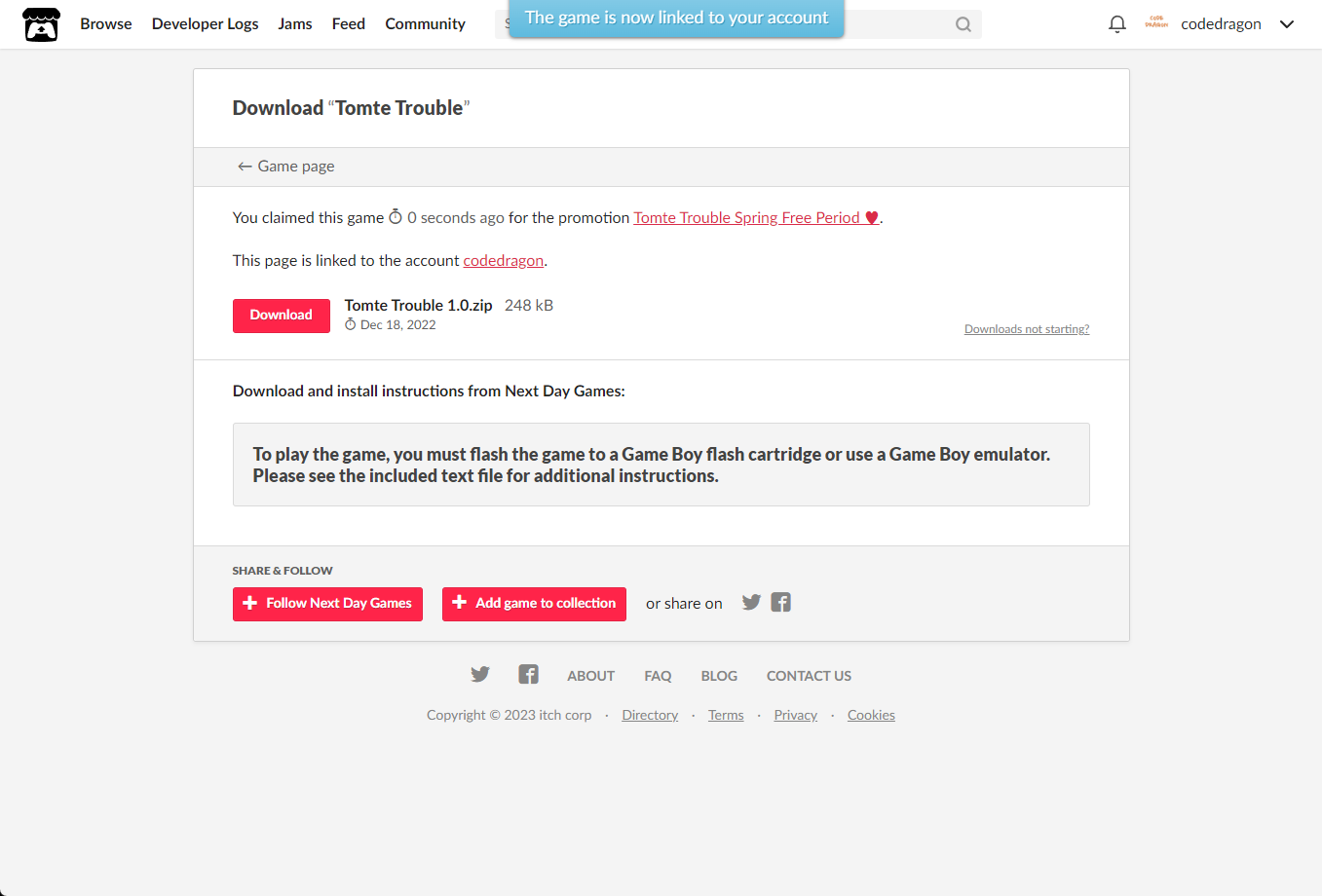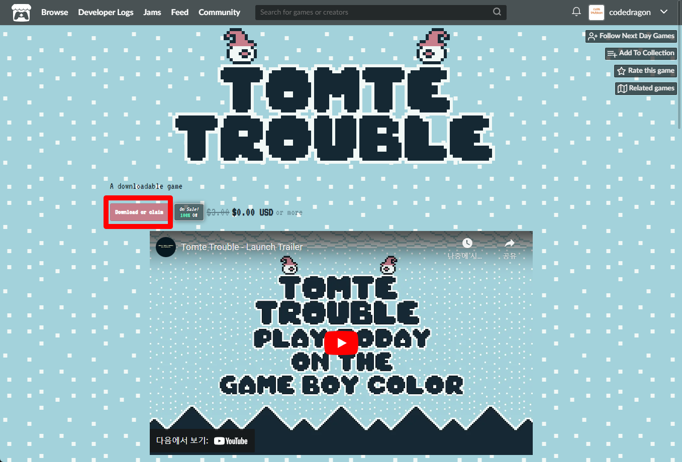 [Claim game]을 클릭하면 "Tomte Trouble" 게임이 나의 게임 라이브러리에 추가되고 설치파일을 다운받을 수 있는 페이지로 이동됩니다.