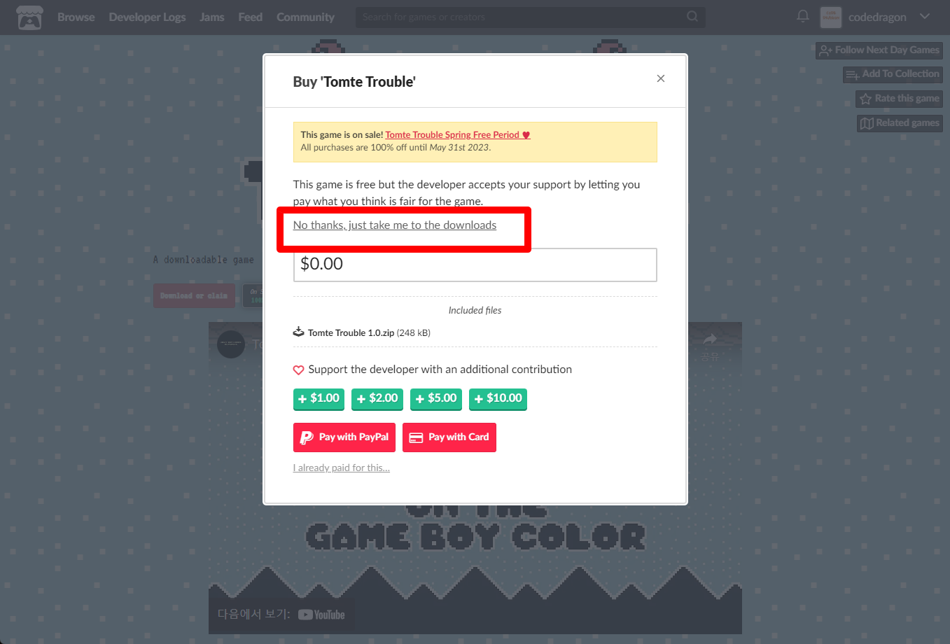 "Tomte Trouble" 구매창에서 [No thanks, just take me to the downloads] 링크를 클릭합니다.