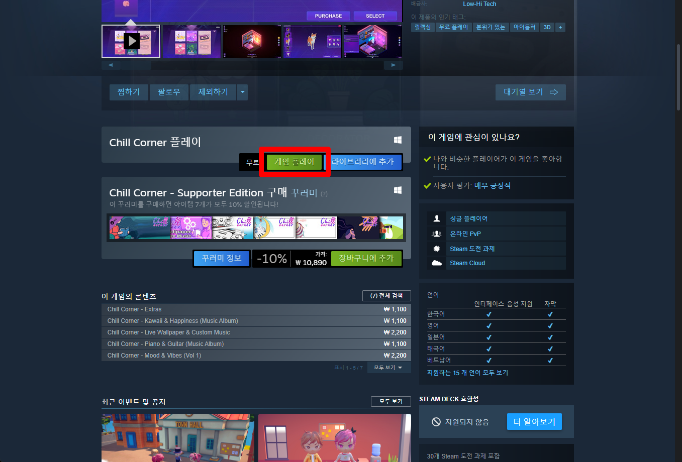 "Chill Corner - Relaxing Mini Games" 페이지를 내려 [게임 플레이]를 클릭하면 됩니다.