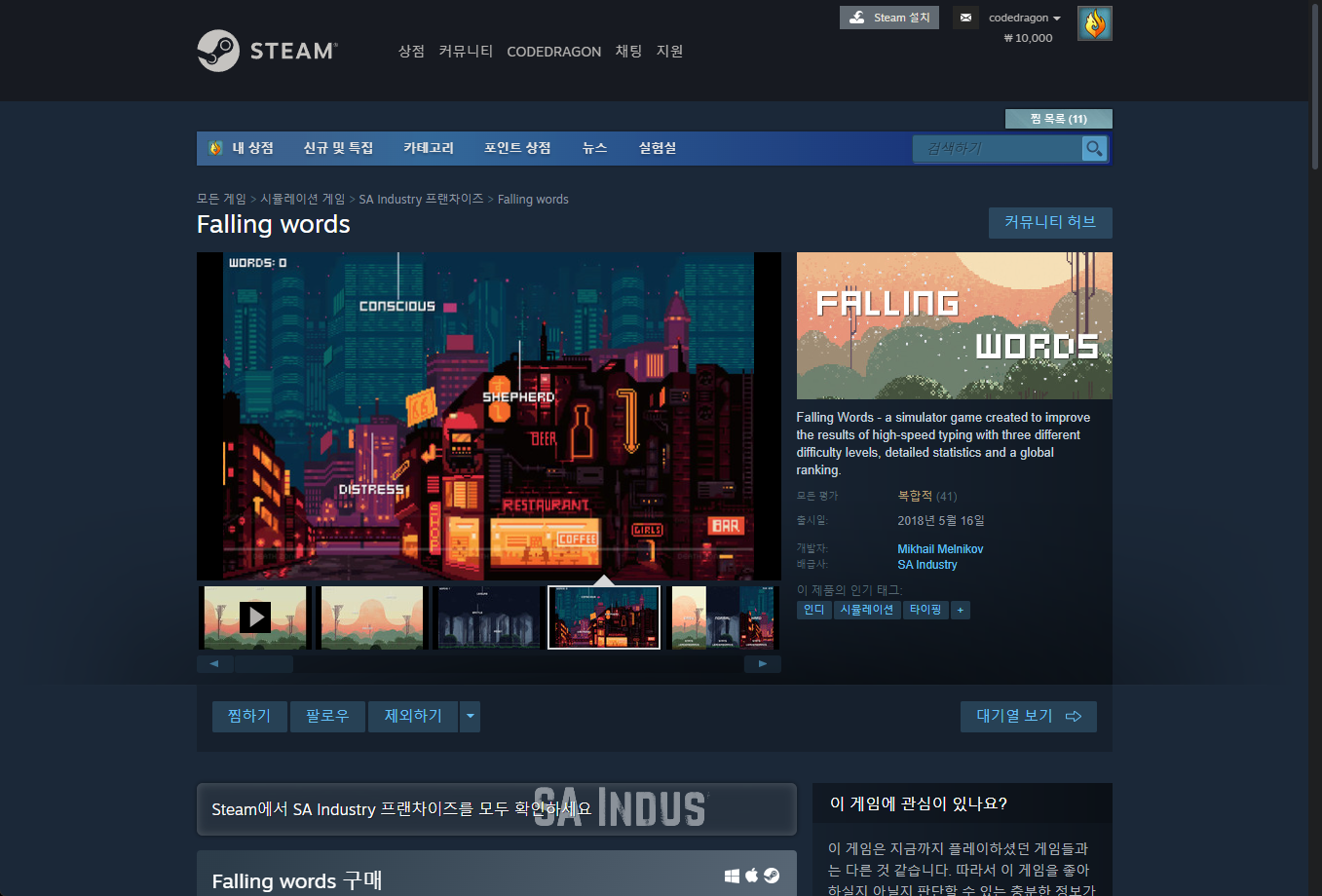 "Falling words" 게임 스팀 페이지입니다.