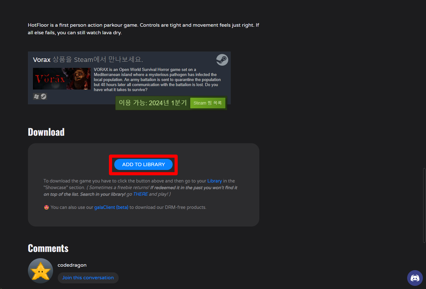 "HotFloor" 게임 페이지를 내려 [ADD TO LIBRARY]를 클릭합니다.