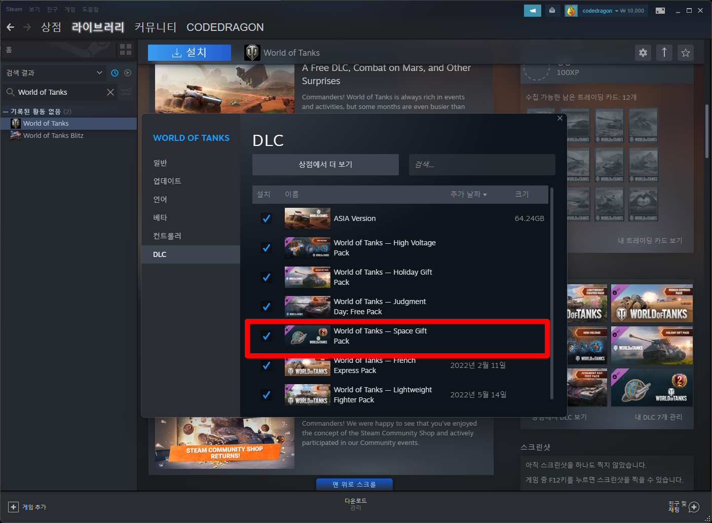 DLC관리창에서 방금 받은 "World of Tanks — Space Gift Pack" DLC 항목을 확인할 수 있습니다.