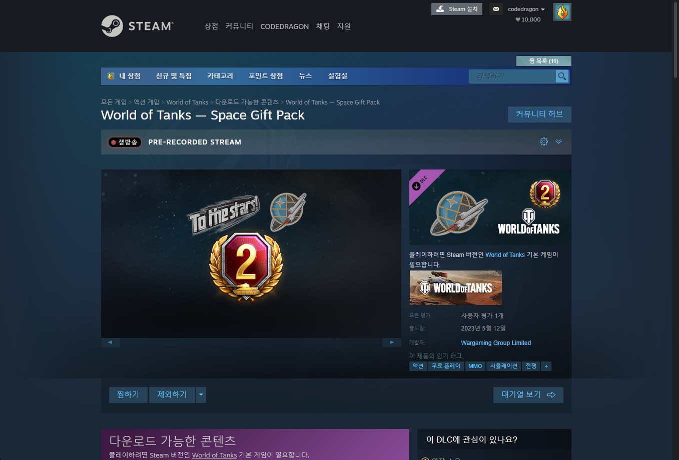 "World of Tanks — Space Gift Pack" 해당 DLC를 받기 위해서는 베이스게임(World of Tanks)을 보유하고 있거나 구매해야 합니다.
