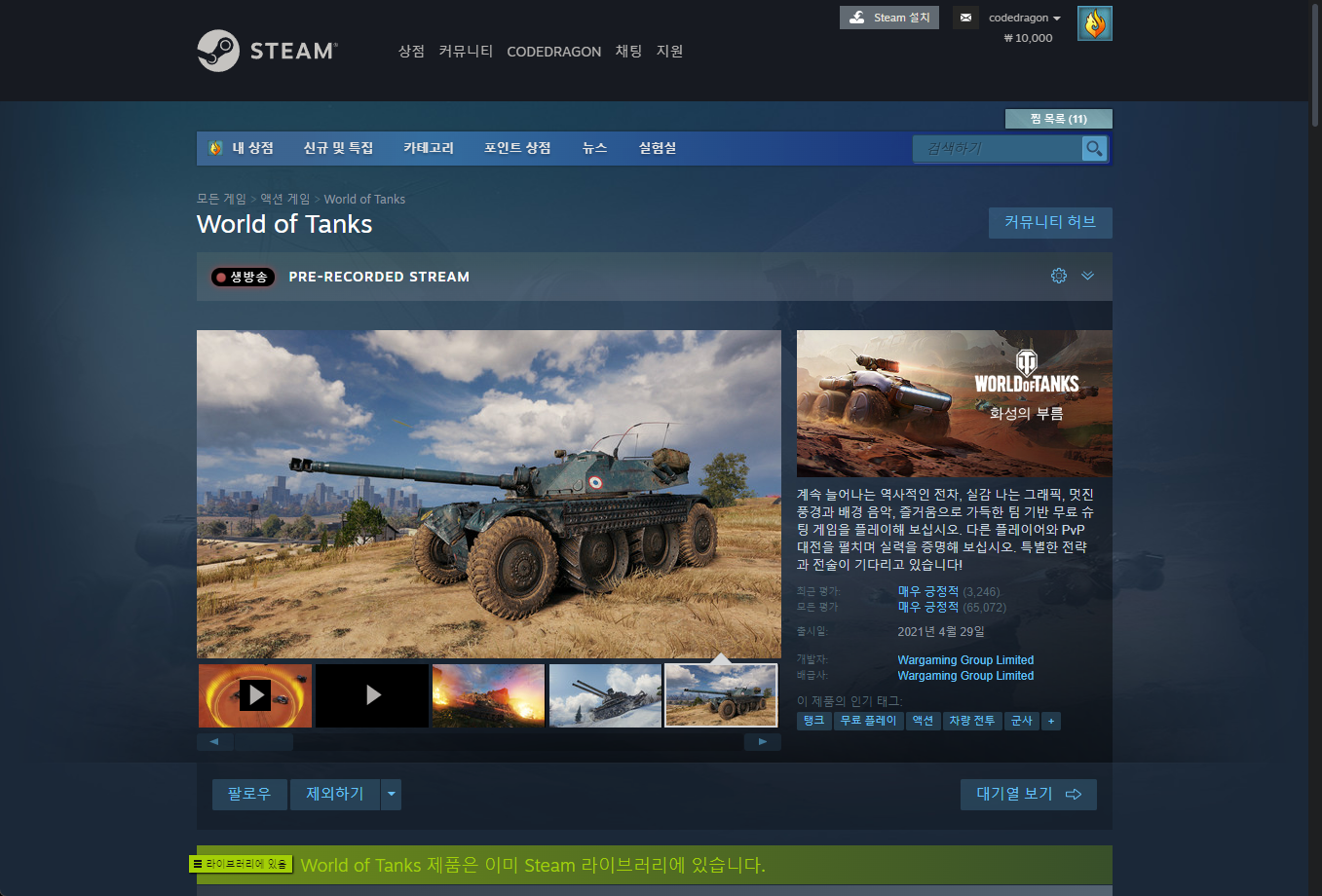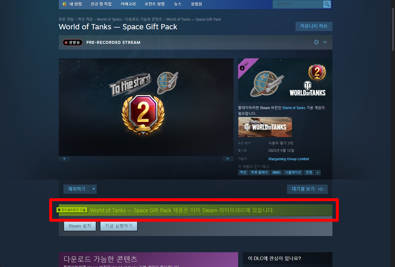 다시 "World of Tanks — Space Gift Pack" 게임페이지로 돌아와 보면 녹색으로 게임라이브러리에 추가되었음을 확인할 수 있습니다.