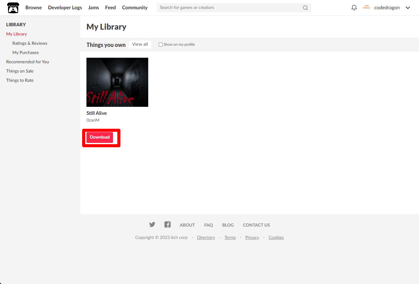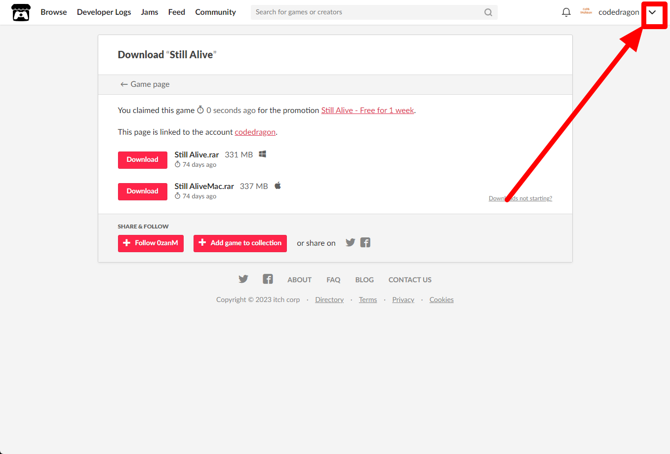 itch.io에서 받은 "Still Alive" 게임 확인하고 설치파일 다운받아 보겠습니다. 우측 상단의 나의 사용자명 오른쪽의 화살표 아이콘을 클릭합니다.