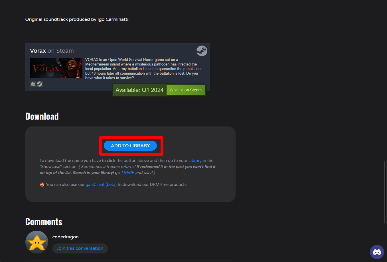 "Overcast - Walden and the Werewolf" 게임 페이지를 내려 [ADD TO LIBRARY]를 클릭합니다.
