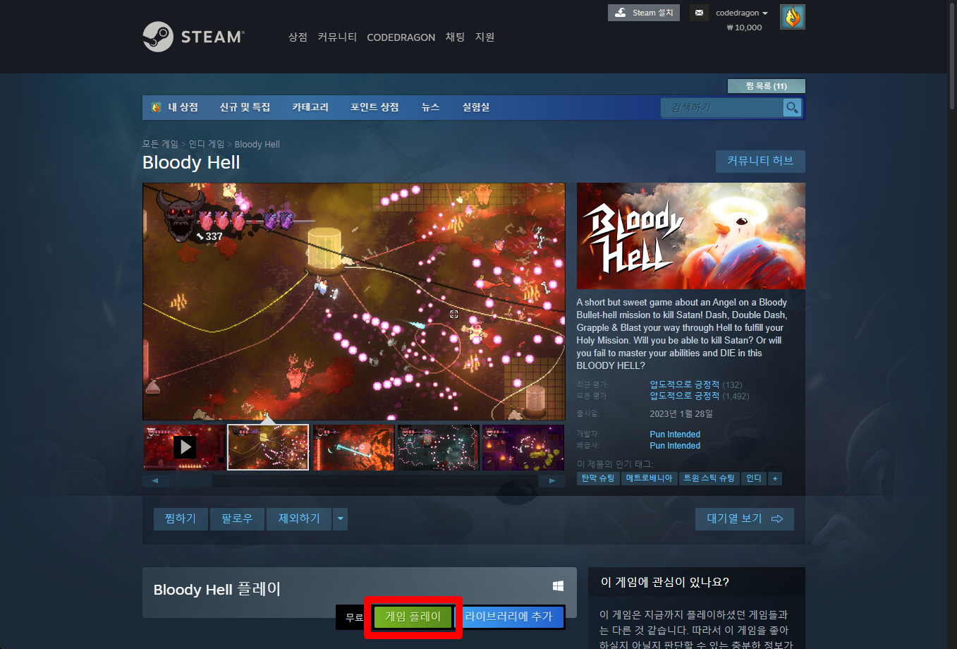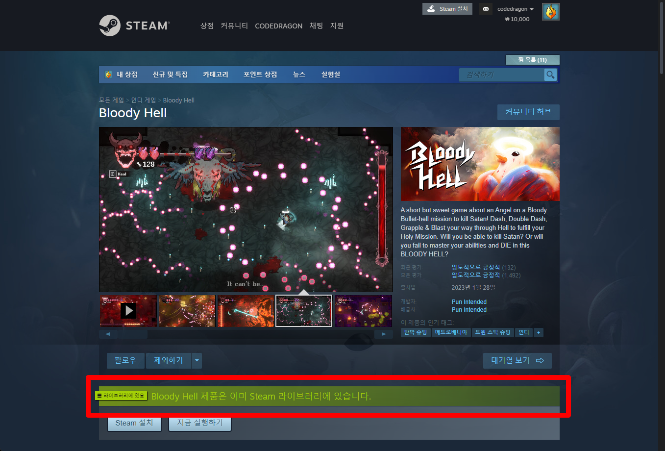 "Bloody Hell" 게임페이지 녹색으로 "라이브러리에 있음" 으로 표시되어 게임을 가지고 있는 것 확인할 수 있습니다.