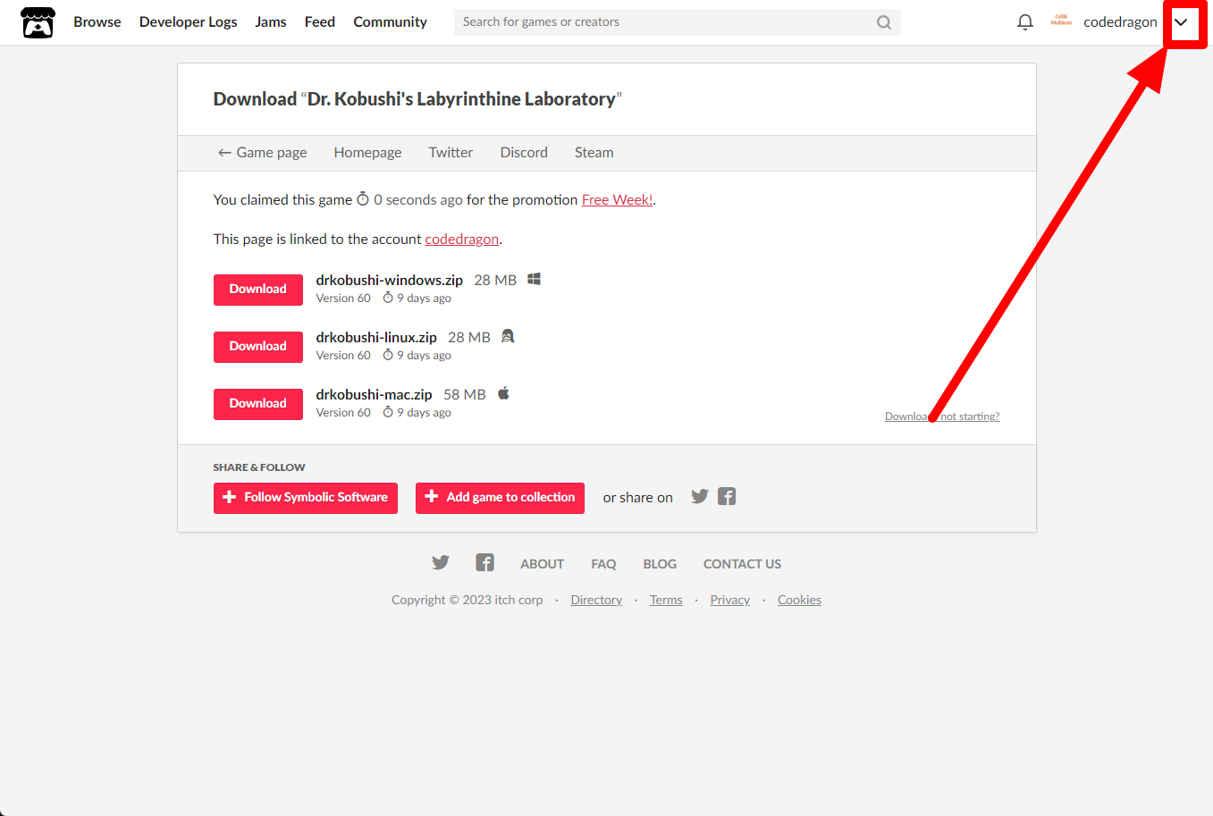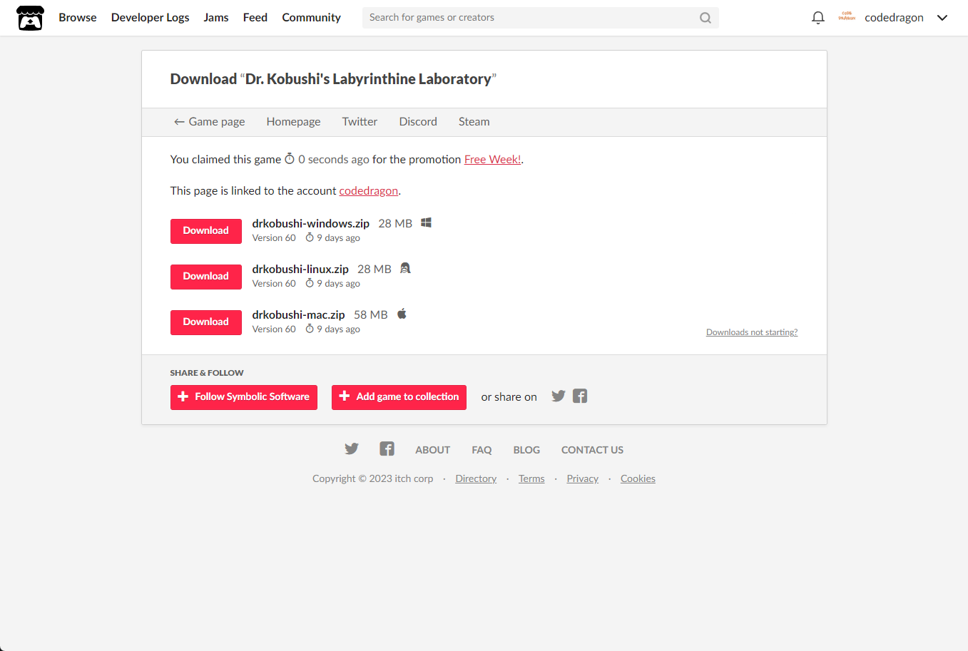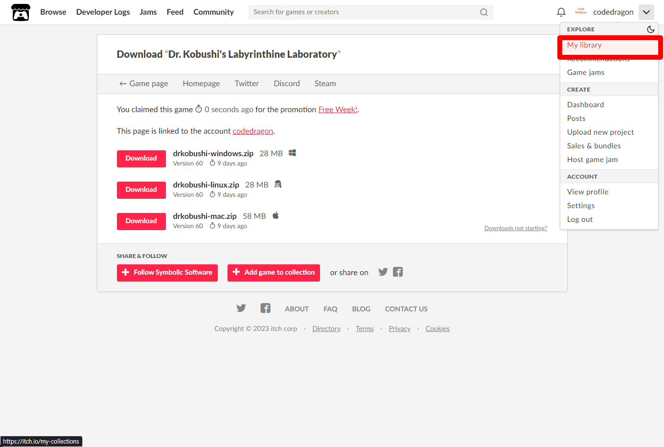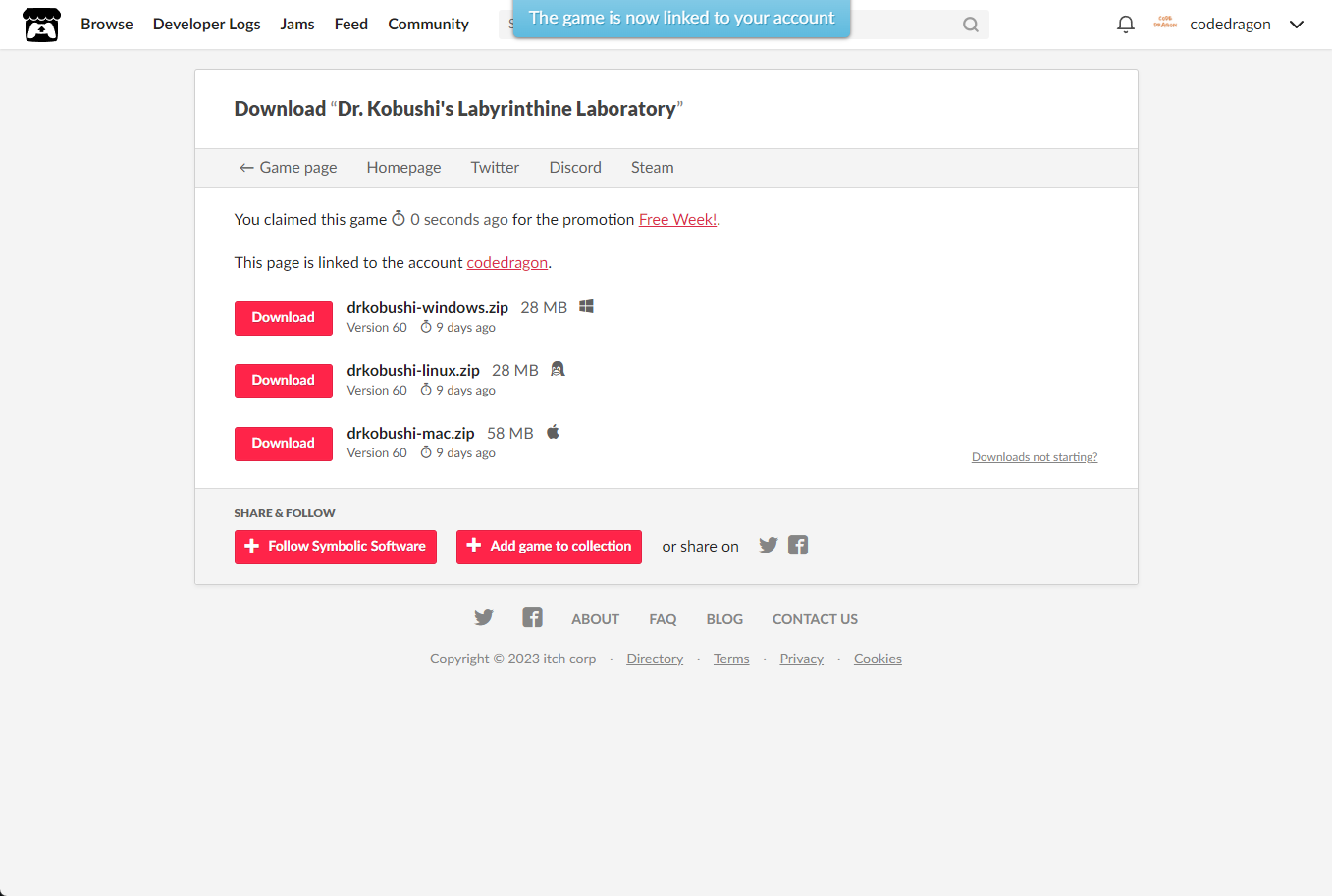 [Claim game]을 클릭하면 "Dr. Kobushi's Labyrinthine Laboratory" 게임이 나의 게임 라이브러리에 추가되고 설치파일을 다운받을 수 있는 페이지로 이동됩니다.