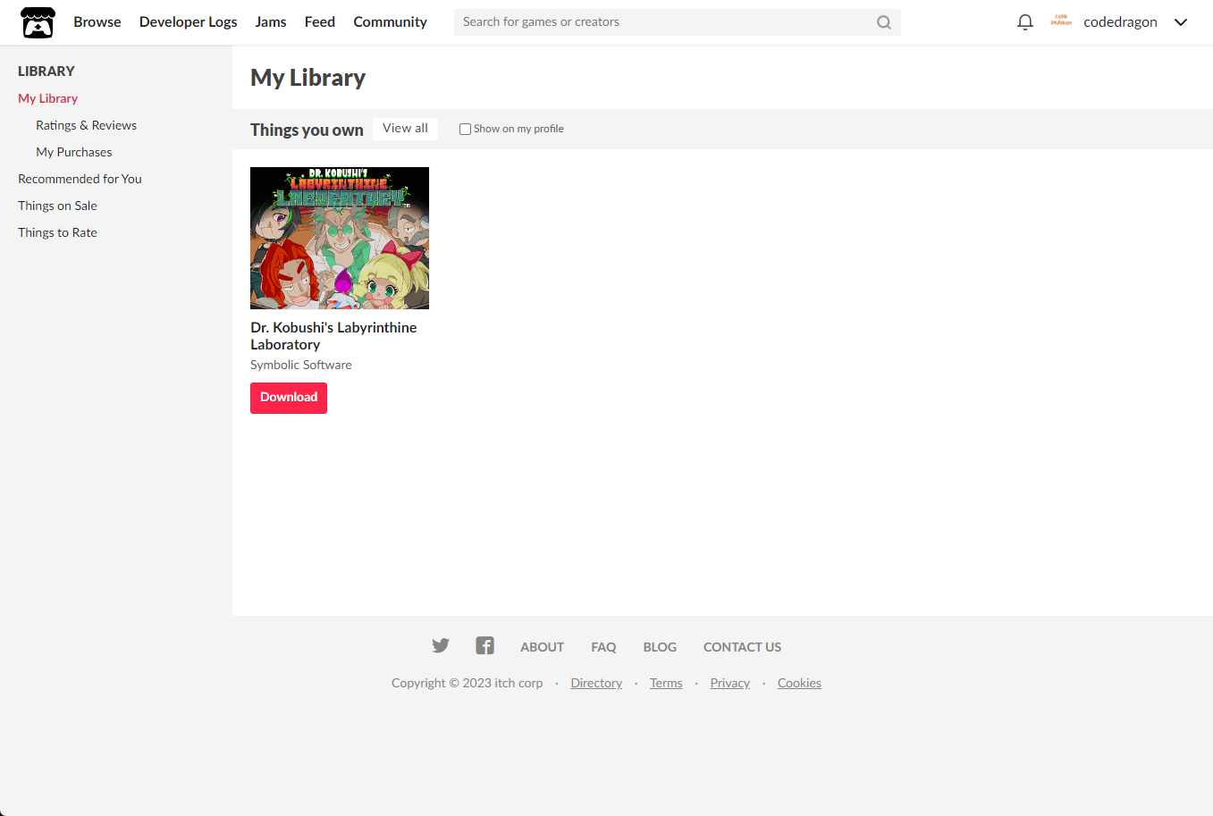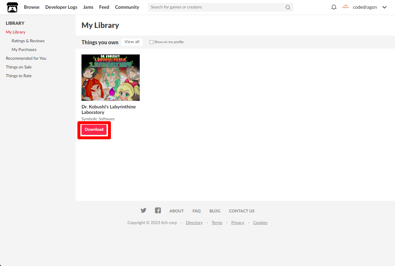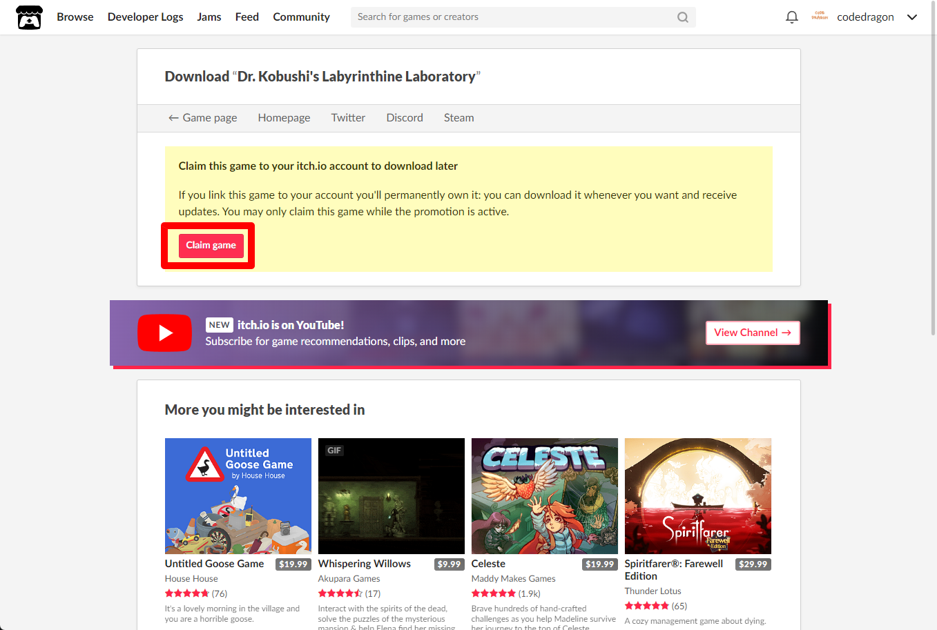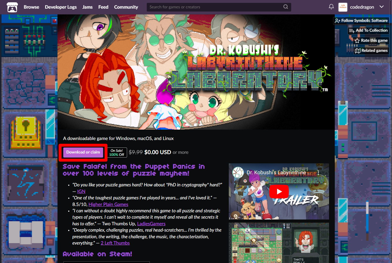[Claim game]을 클릭하면 "Dr. Kobushi's Labyrinthine Laboratory" 게임이 나의 게임 라이브러리에 추가되고 설치파일을 다운받을 수 있는 페이지로 이동됩니다.