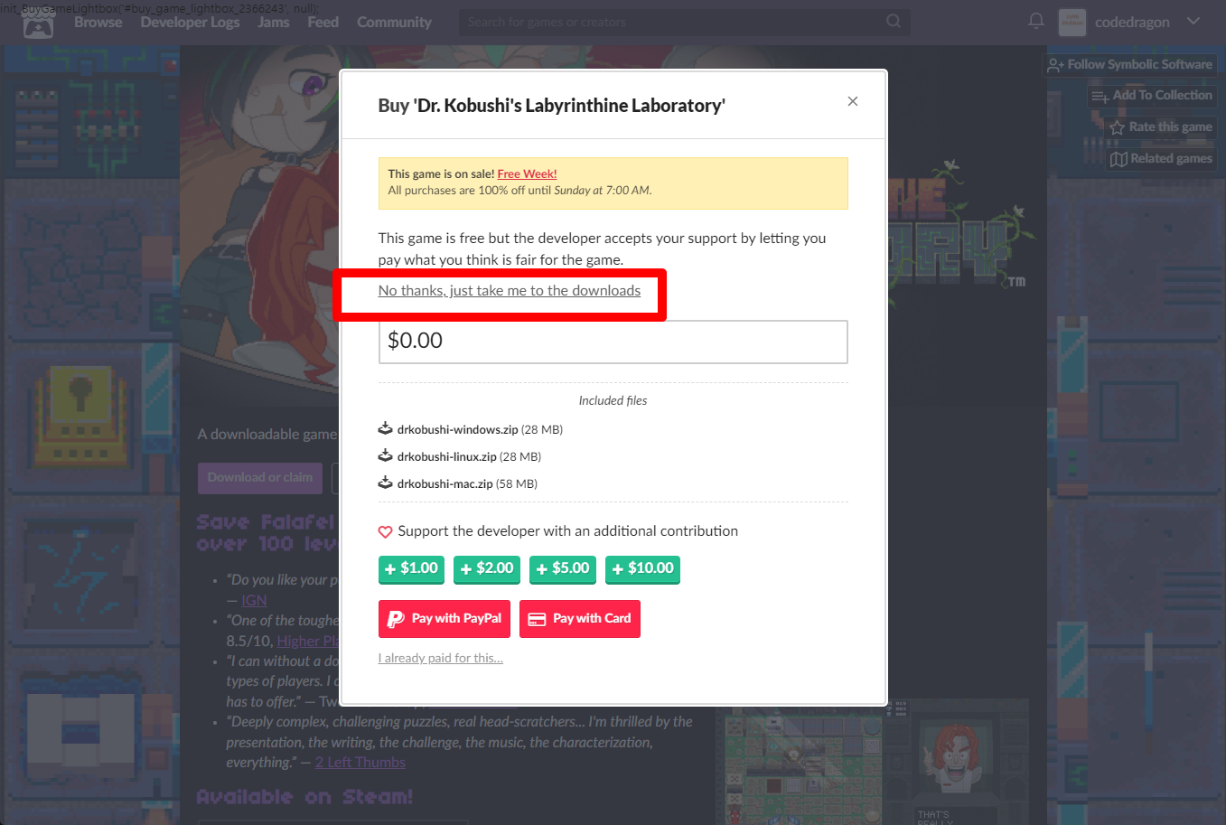 "Dr. Kobushi's Labyrinthine Laboratory" 구매 팝업창에서 [No thanks, just take me to the downloads] 링크를 클릭합니다.