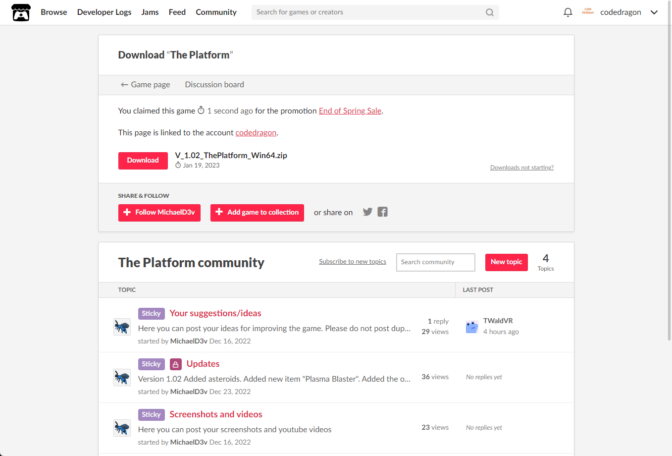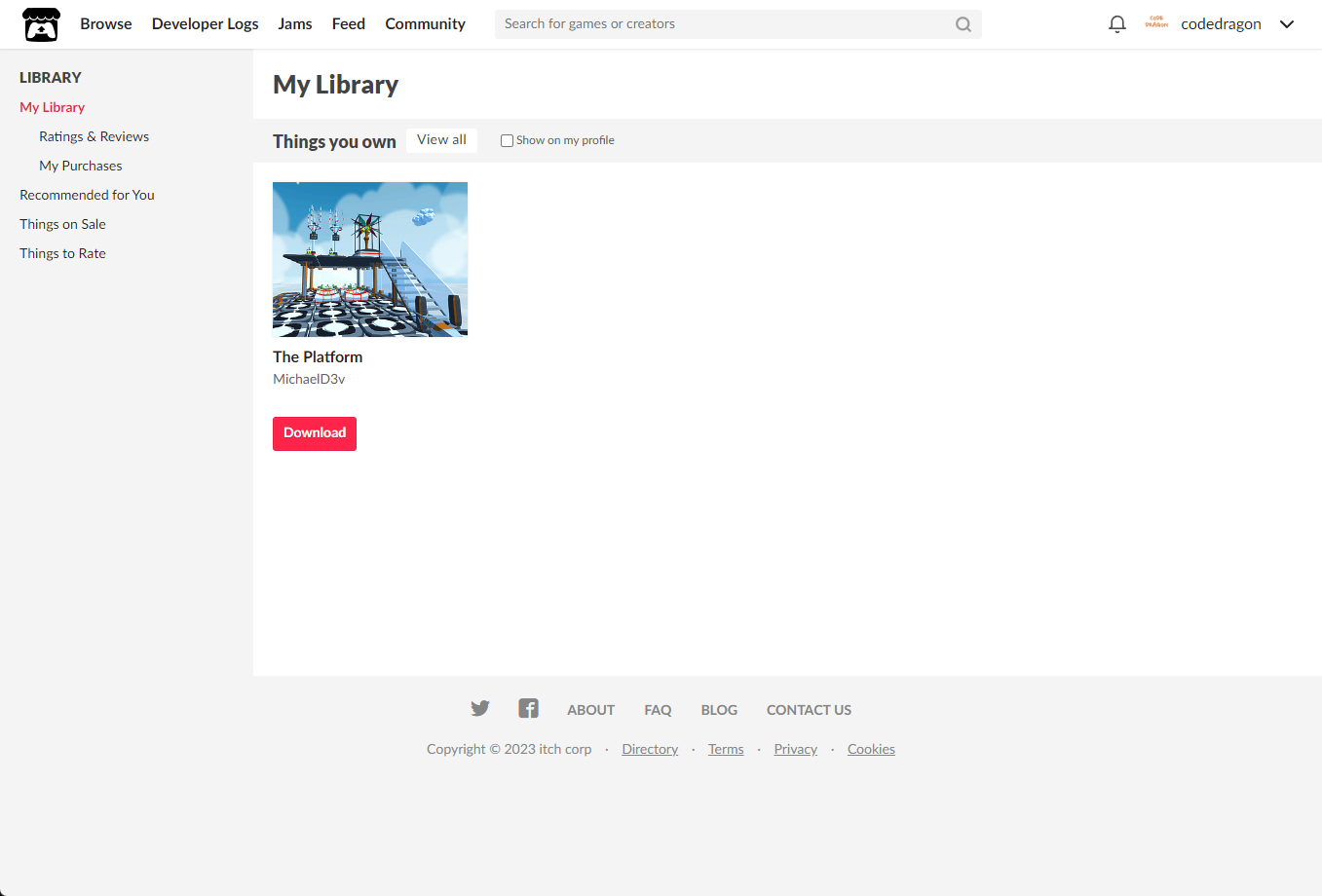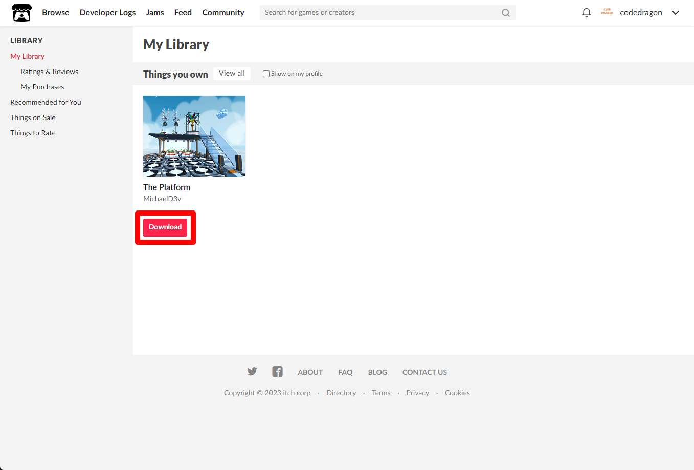[Claim game]을 클릭하면 "The Platform" 게임이 나의 게임 라이브러리에 추가되고 설치파일을 다운받을 수 있는 페이지로 이동됩니다.