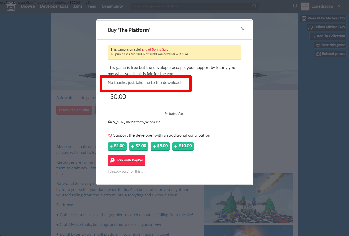"The Platform" 구매 팝업창에서 [No thanks, just take me to the downloads] 링크를 클릭합니다.