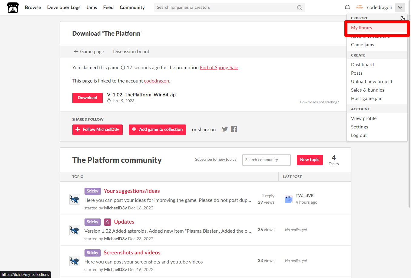 "My Lirary"에서 방금 받은 "The Platform" 게임 항목을 확인할 수 있습니다.