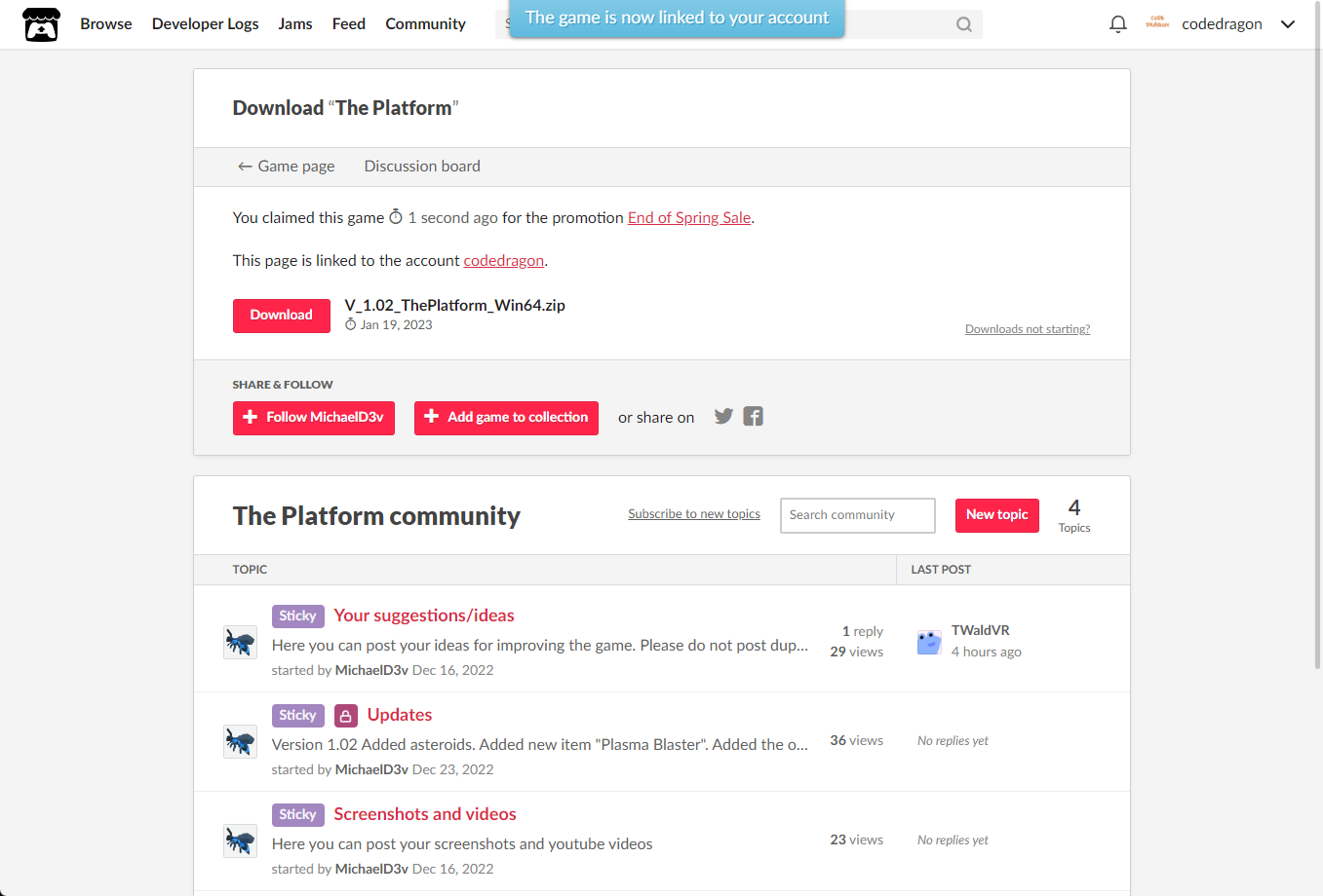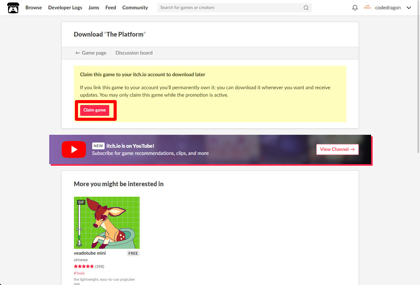 [Claim game]을 클릭하면 "The Platform" 게임이 나의 게임 라이브러리에 추가되고 설치파일을 다운받을 수 있는 페이지로 이동됩니다.