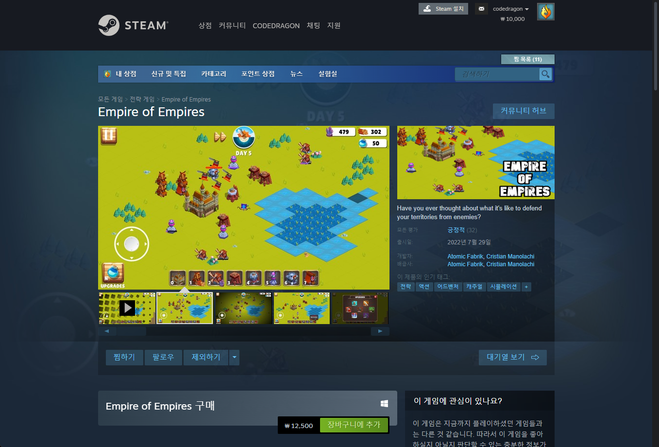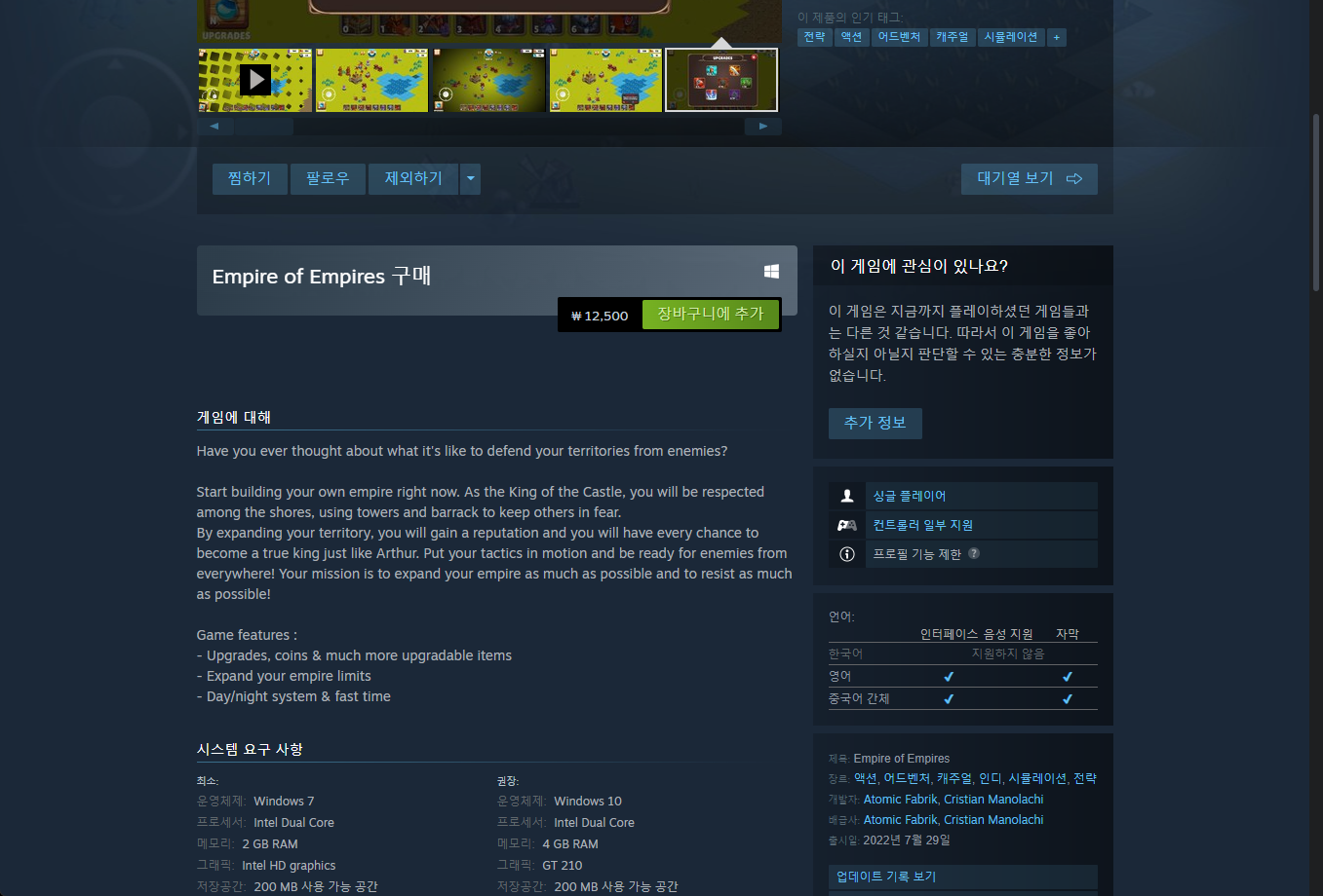 "Empire of Empires" 게임 스팀 페이지입니다.