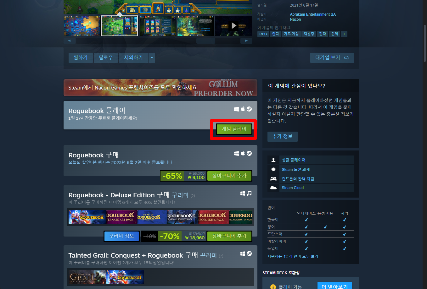 "Roguebook" 게임페이지를 조금 내려서 [게임 플레이] 버튼을 클릭하면 됩니다.
