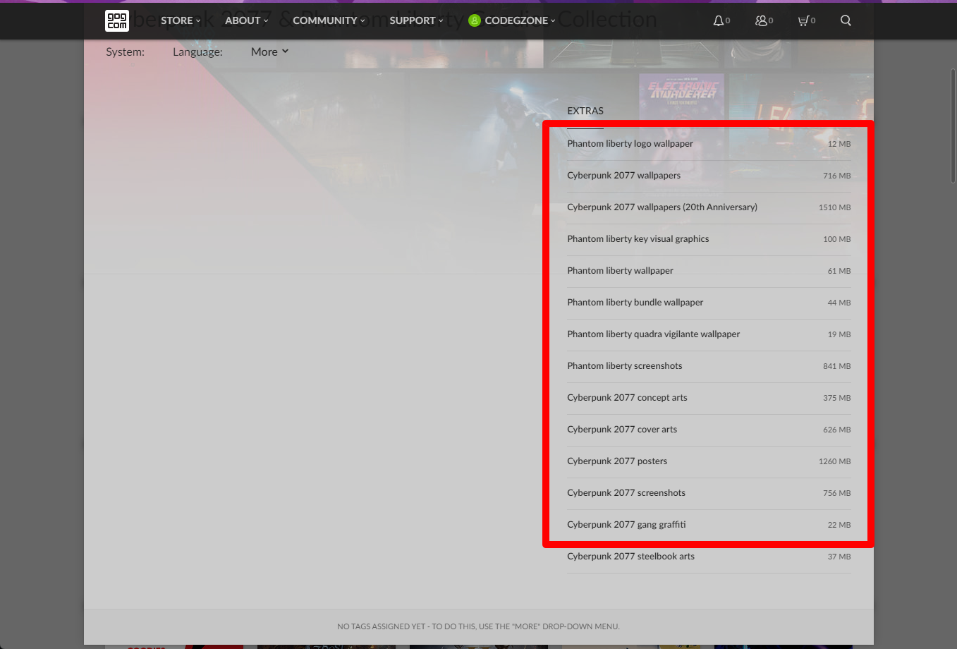 해당 항목을 클릭한 후 나오는 "Cyberpunk 2077 & Phantom Liberty Goodies Collection" 게임 페이지에있는 "EXTRAS" 항목을 클릭하면 디지털 파일 다운받을 수 있습니다.