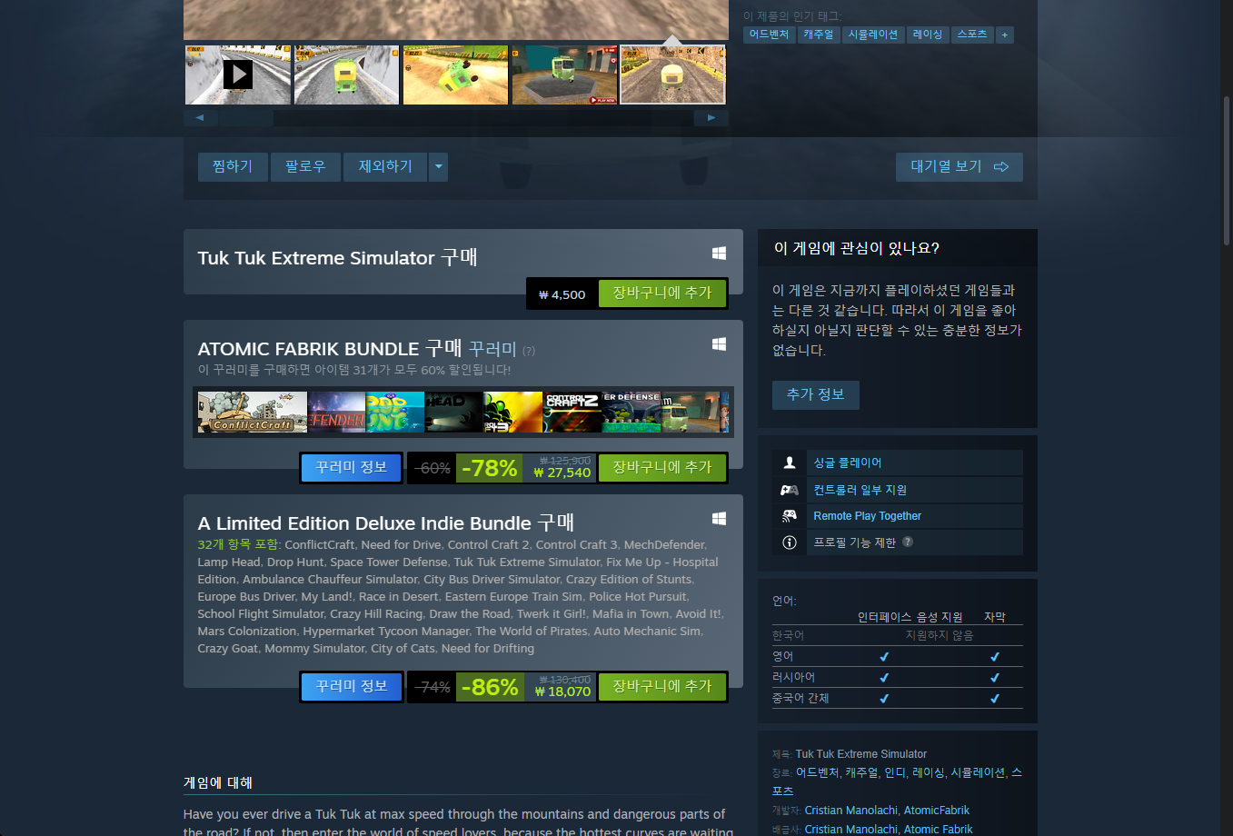 - "Tuk Tuk Extreme Simulator" - Steam 스팀 페이지