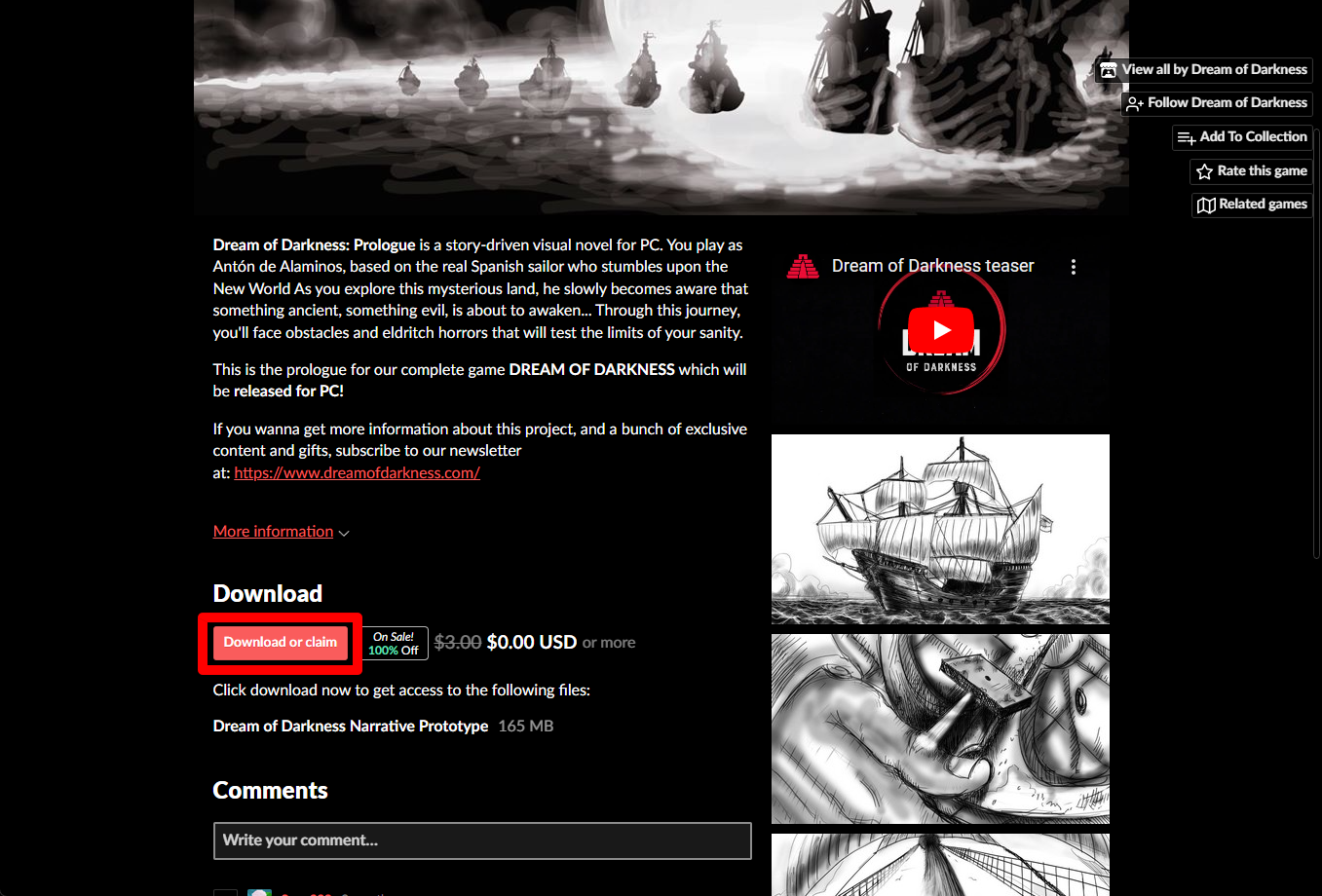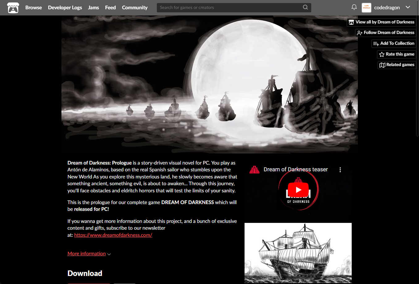 "Dream of Darkness: Prologue" 페이지를 조금 내려 [Download Now]을 클릭합니다.