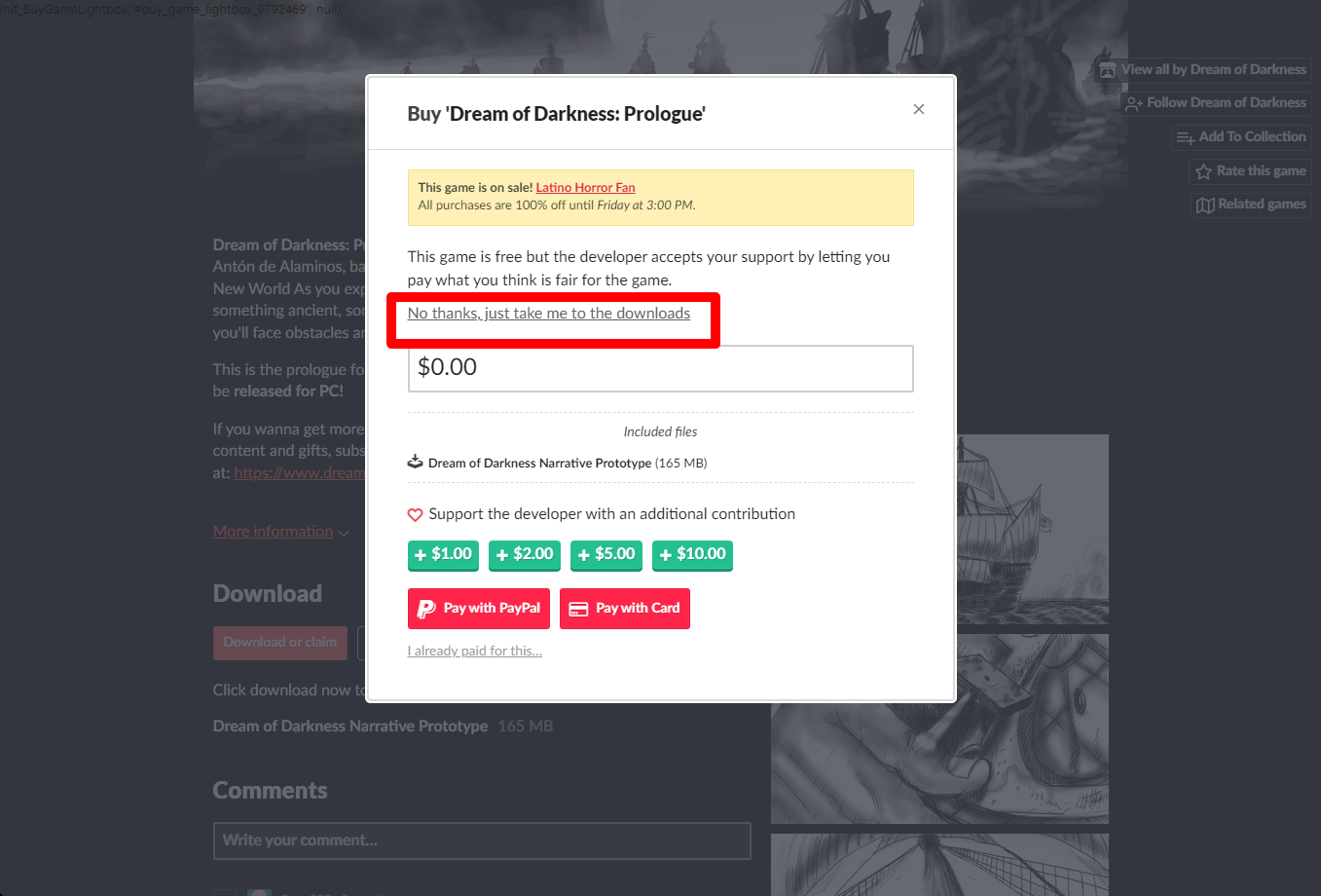 "Dream of Darkness: Prologue" 구매 팝업창에서 [No thanks, just take me to the downloads] 링크를 클릭합니다.