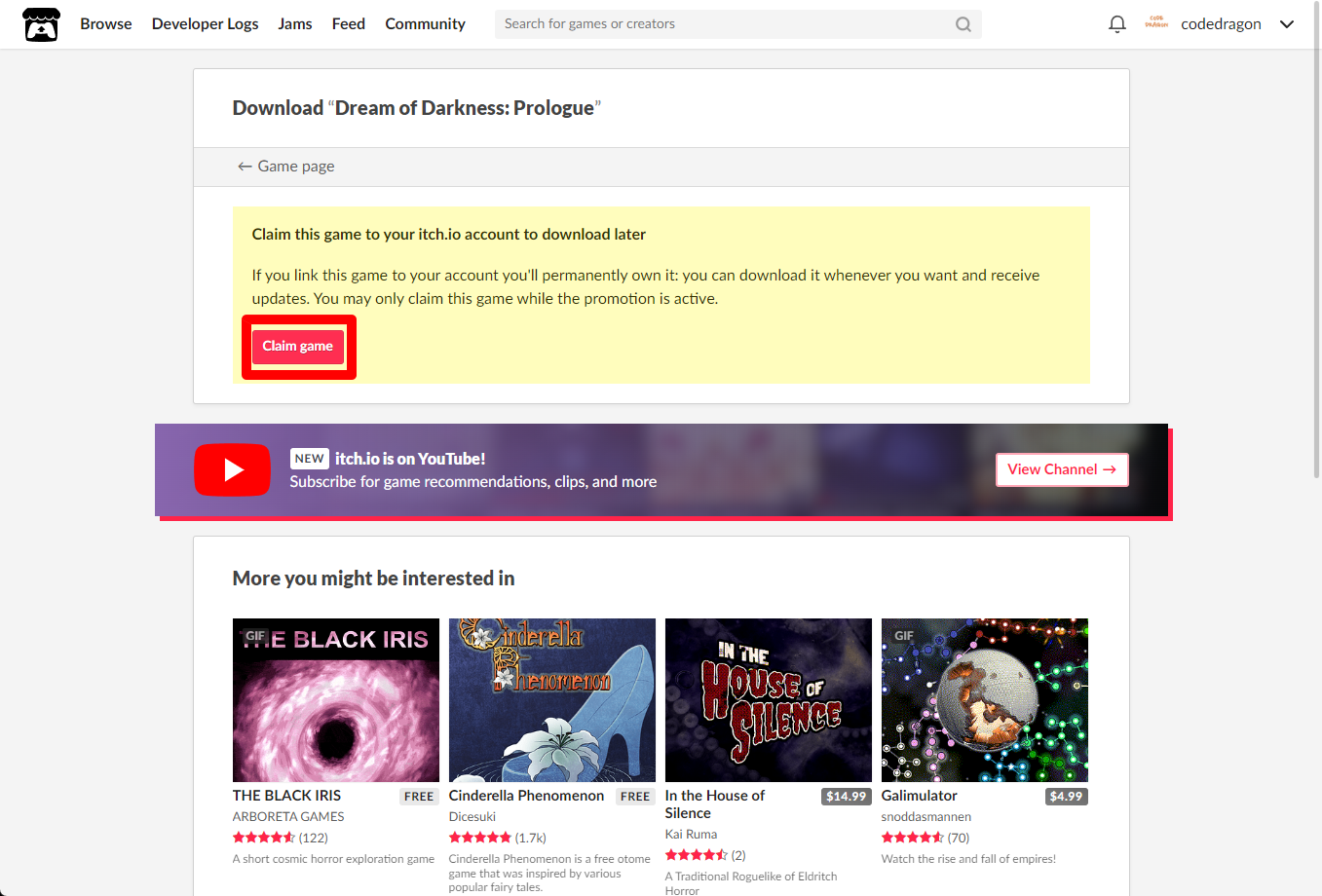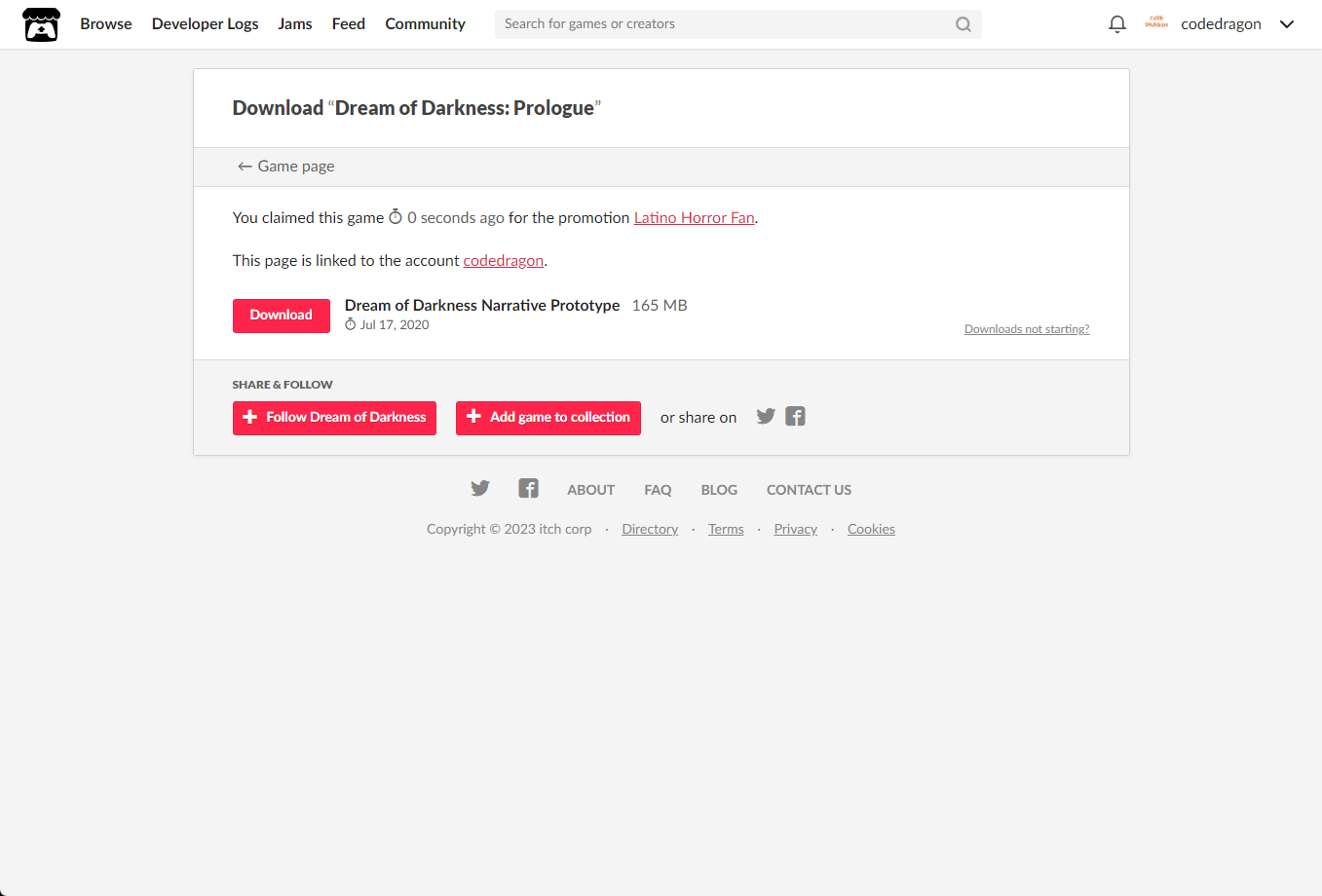 [Claim game]을 클릭하면 "Dream of Darkness: Prologue" 게임이 나의 게임 라이브러리에 추가되고 설치파일을 다운받을 수 있는 페이지로 이동됩니다.