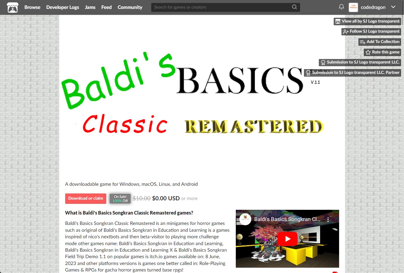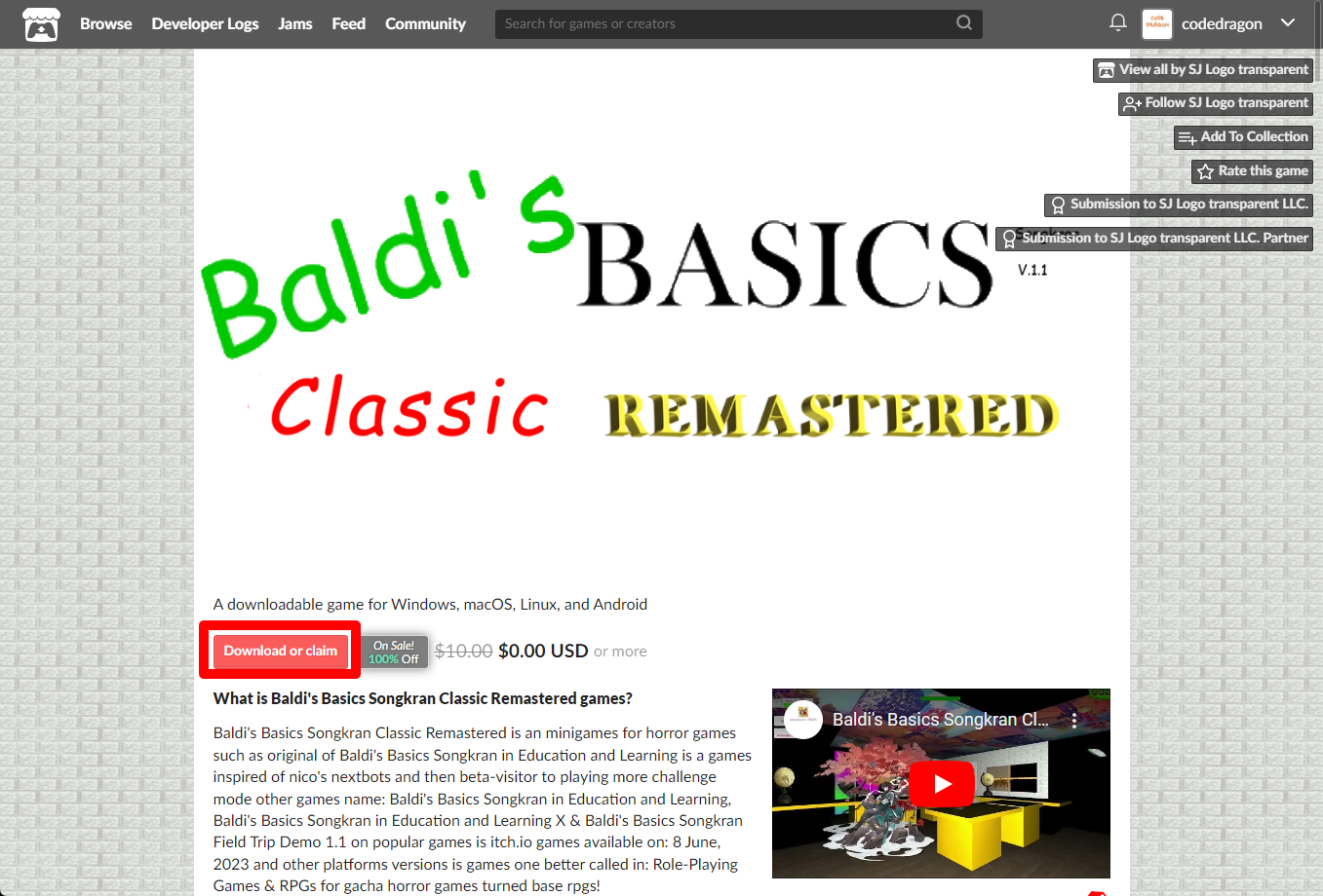"Baldi's Basics Songkran Classic Remastered" 페이지에 있는 [Download or claim]을 클릭합니다.