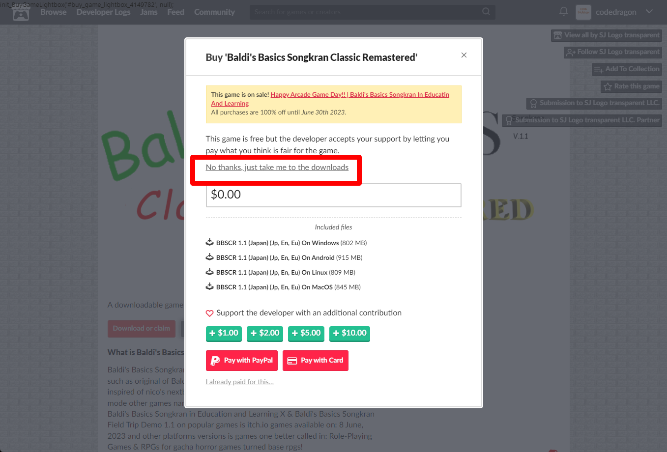 "Baldi's Basics Songkran Classic Remastered" 구매 팝업창에서 [No thanks, just take me to the downloads] 링크를 클릭합니다.