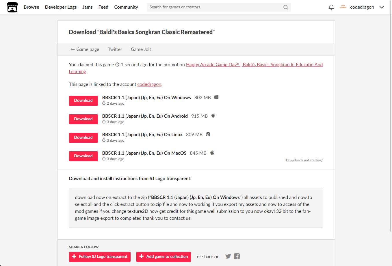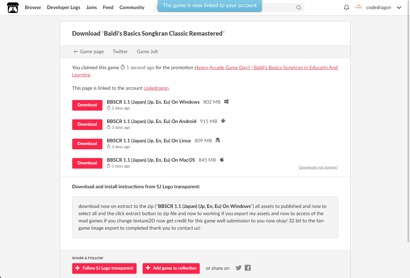 [Claim game]을 클릭하면 "Baldi's Basics Songkran Classic Remastered" 게임이 나의 게임 라이브러리에 추가되고 설치파일을 다운받을 수 있는 페이지로 이동됩니다.