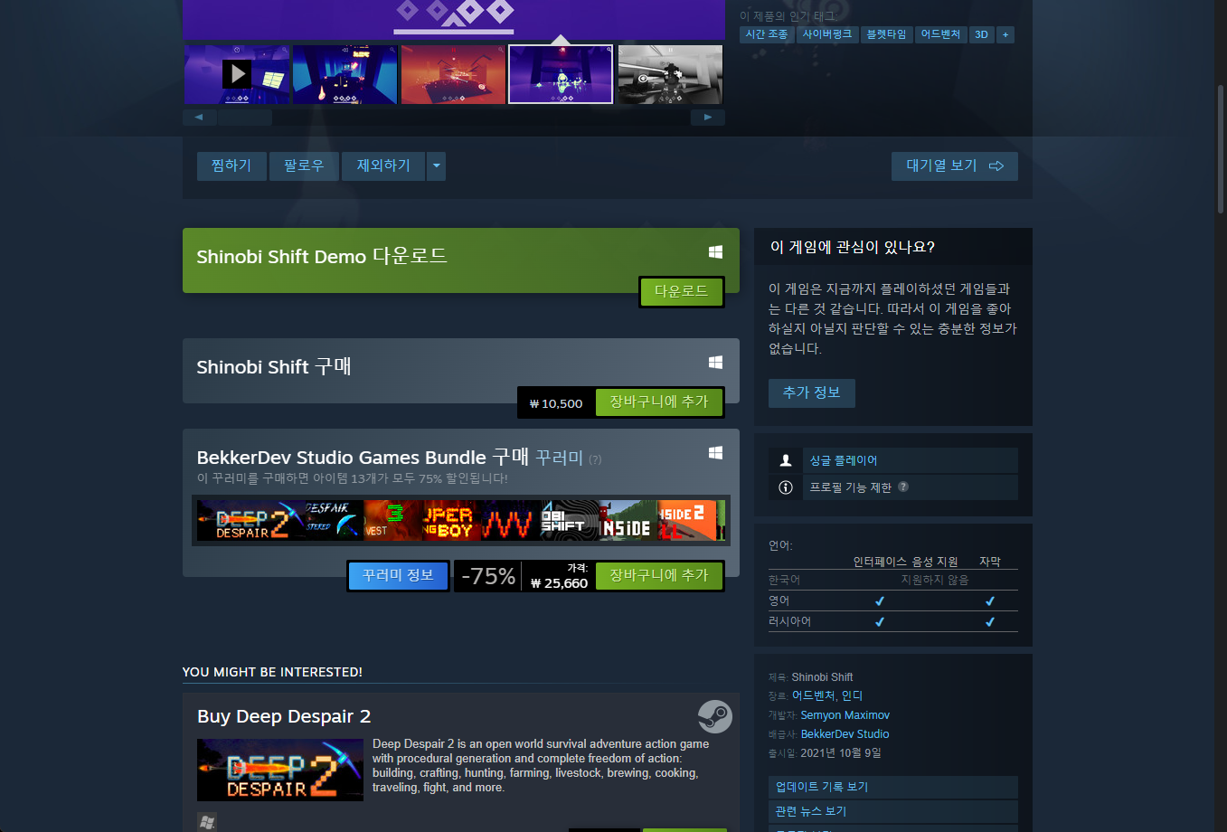 "Shinobi Shift" 게임 스팀 페이지입니다.