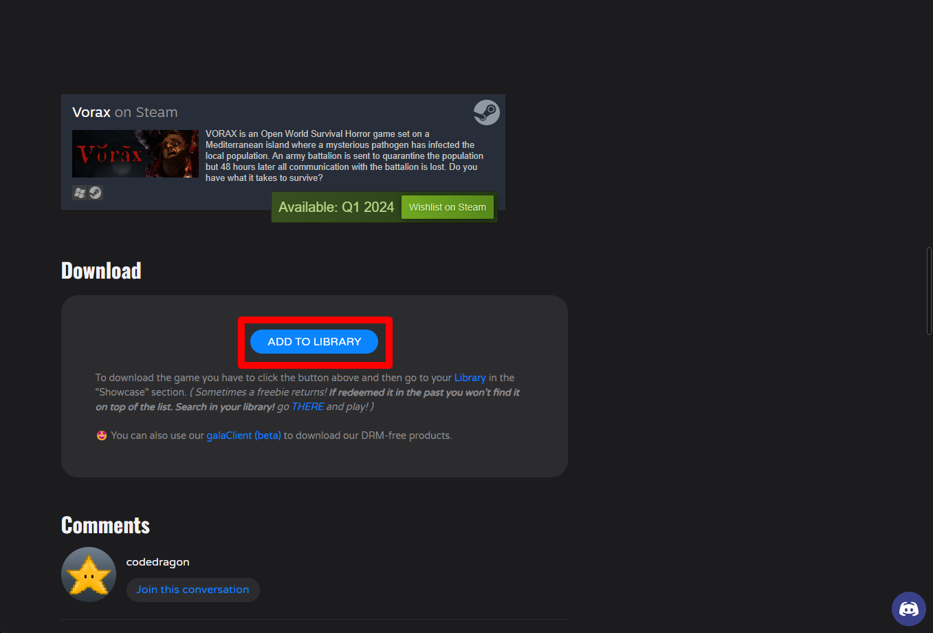 "Avoid It!" 게임 페이지를 내려 [ADD TO LIBRARY]를 클릭합니다.