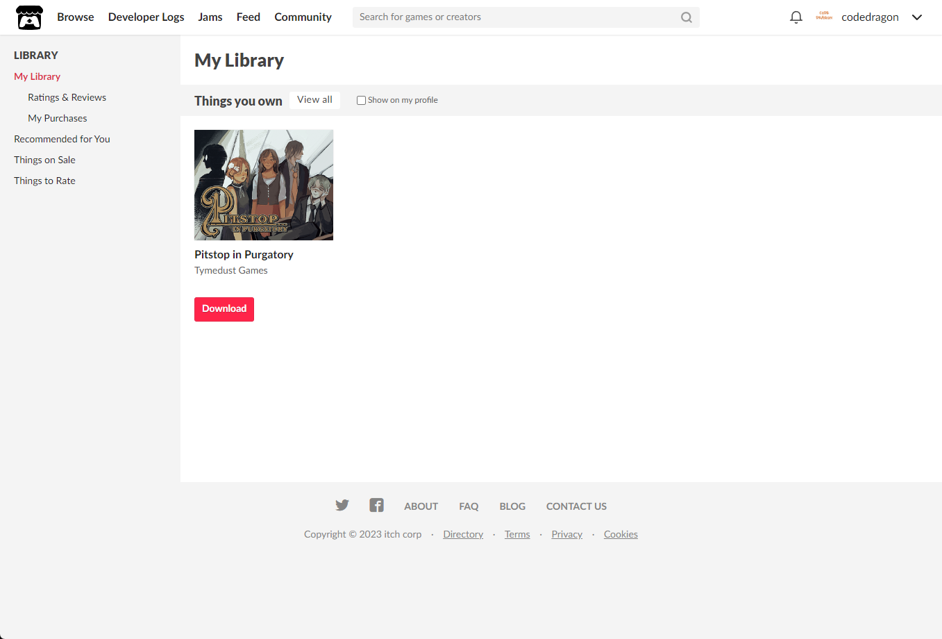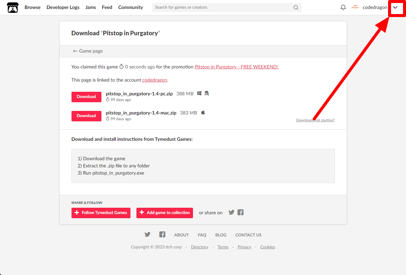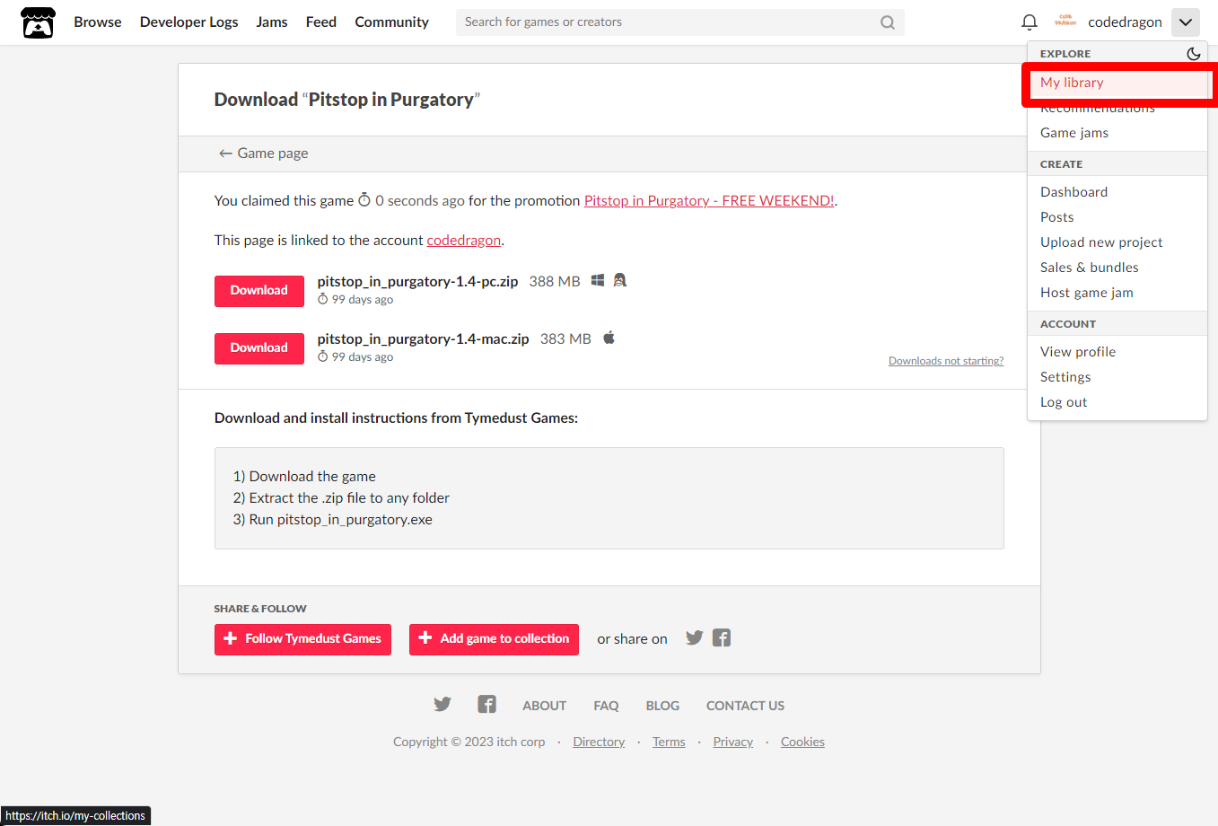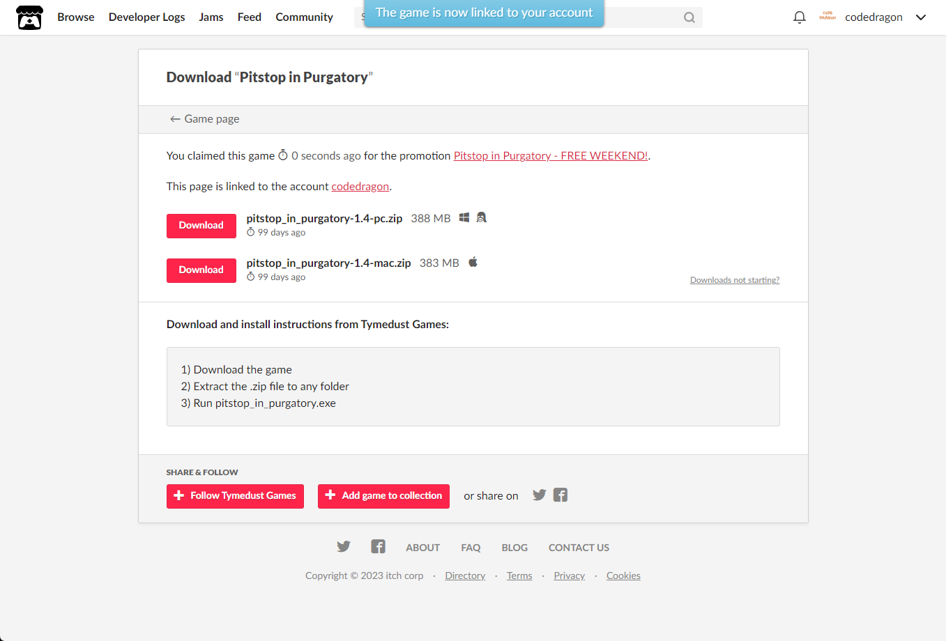[Claim game]을 클릭하면 "Pitstop in Purgatory" 게임이 나의 게임 라이브러리에 추가되고 설치파일을 다운받을 수 있는 페이지로 이동됩니다.