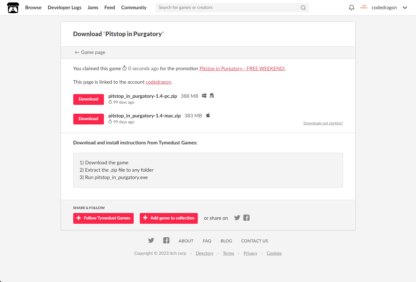 [Claim game]을 클릭하면 "Pitstop in Purgatory" 게임이 나의 게임 라이브러리에 추가되고 설치파일을 다운받을 수 있는 페이지로 이동됩니다.