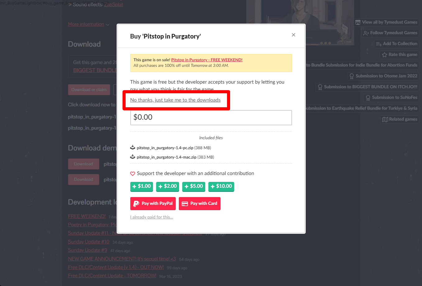 "Pitstop in Purgatory" 구매 팝업창에서 [No thanks, just take me to the downloads] 링크를 클릭합니다.