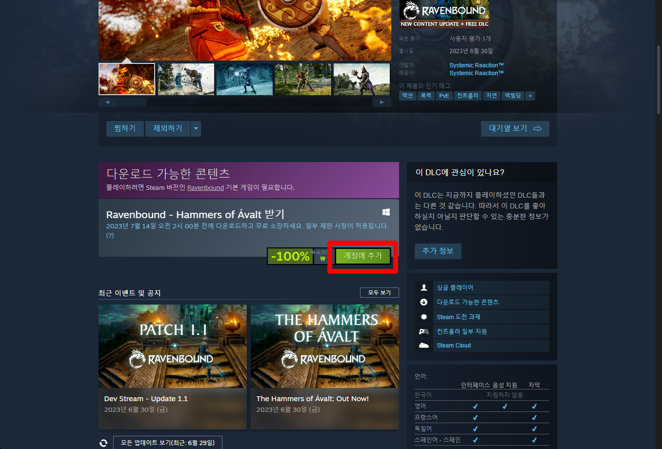 "Ravenbound - Hammers of Ávalt" 게임페이지를 조금 내려준 후 [계정에 추가] 버튼을 클릭하면 게임라이브러리에 추가됩니다.