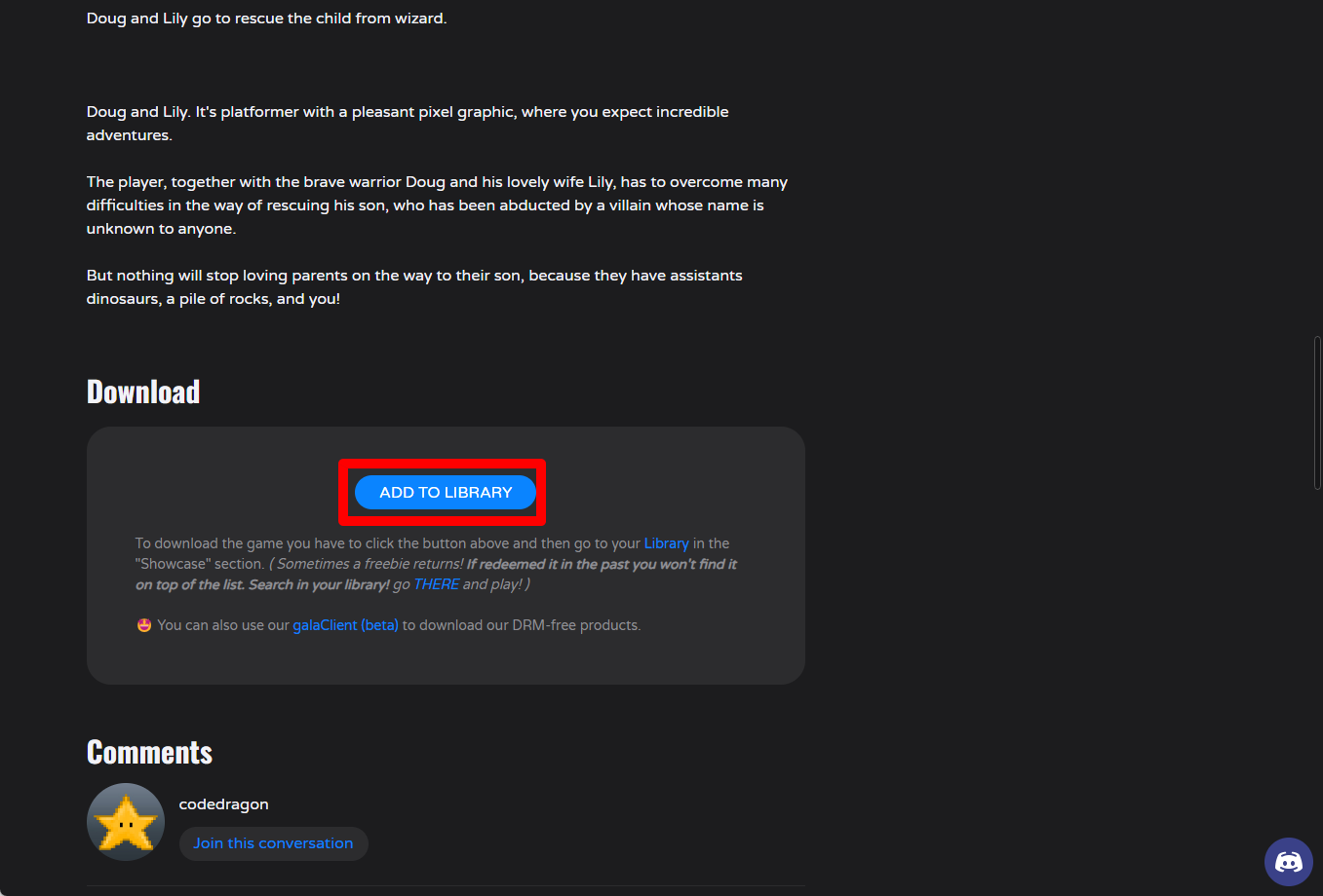 "Doug and Lily" 게임 페이지를 내려 [ADD TO LIBRARY]를 클릭합니다.