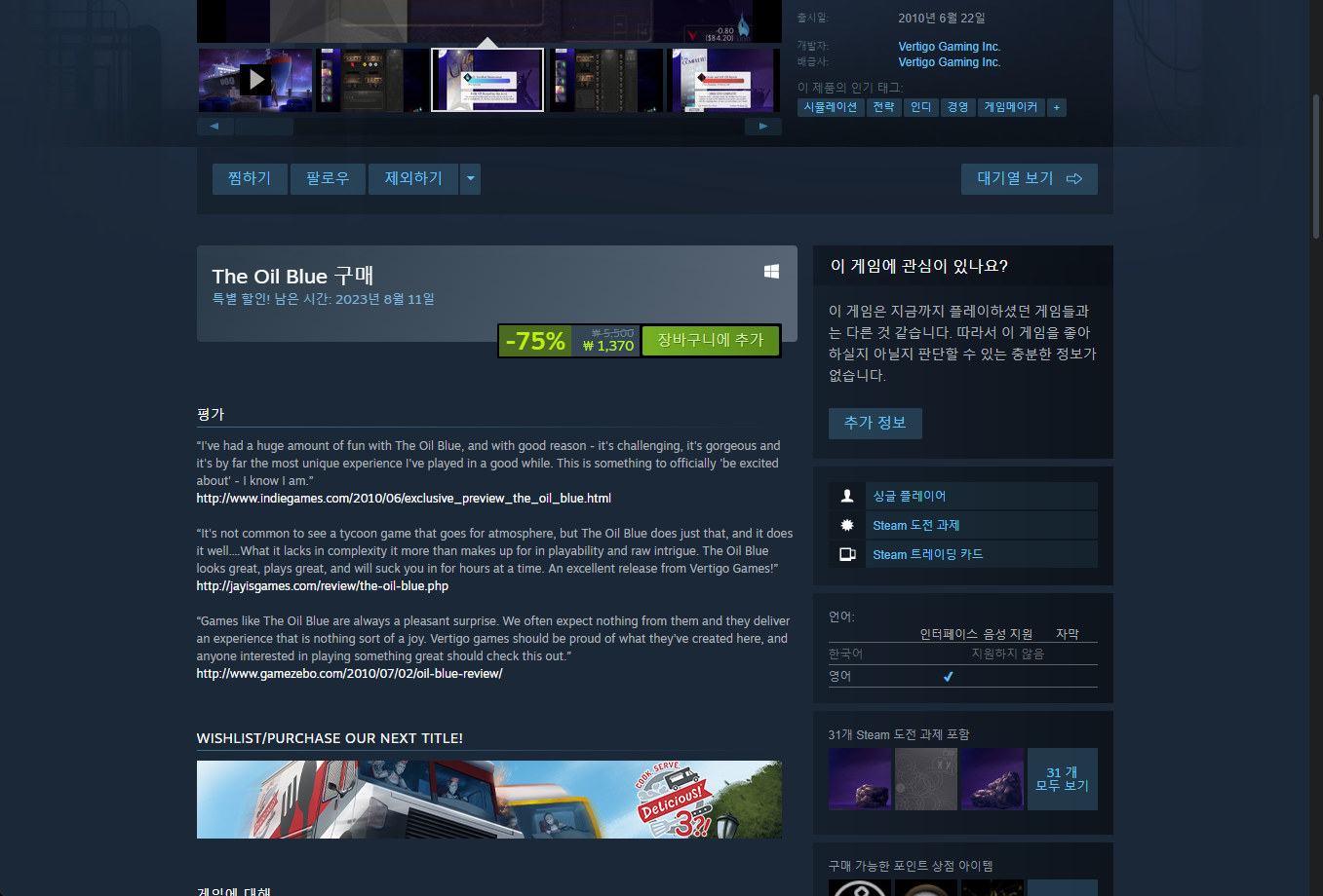 "The Oil Blue" 게임 스팀 페이지입니다.