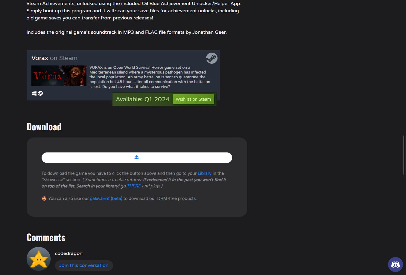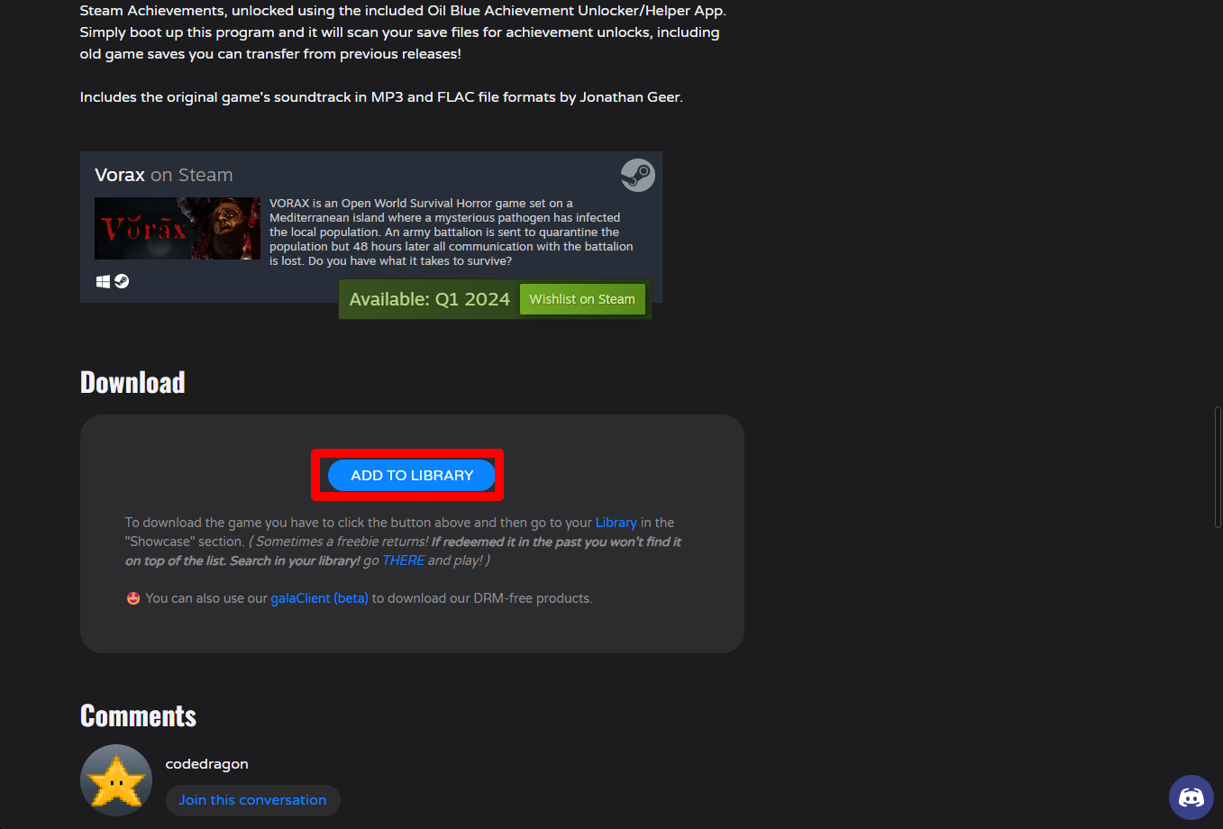 "The Oil Blue" 게임 페이지를 내려 [ADD TO LIBRARY]를 클릭합니다.