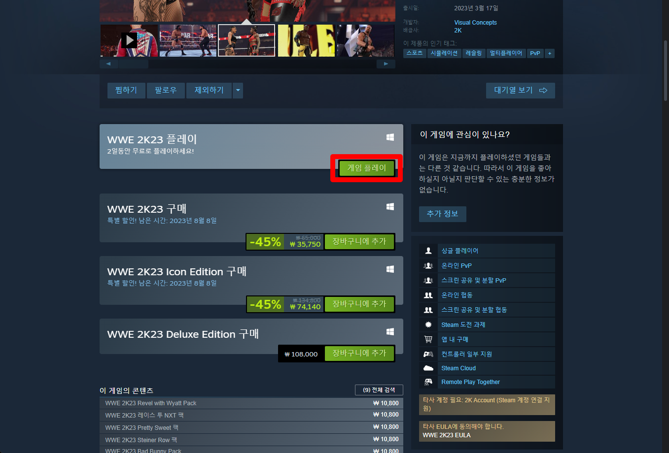 "WWE 2K23" 게임페이지를 조금 내려서 [게임 플레이] 버튼을 클릭하면 됩니다.