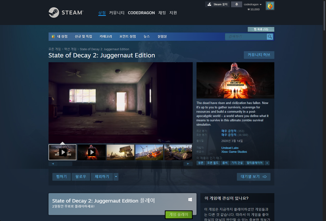 "State of Decay 2: Juggernaut Edition" 게임페이지에 접속합니다.