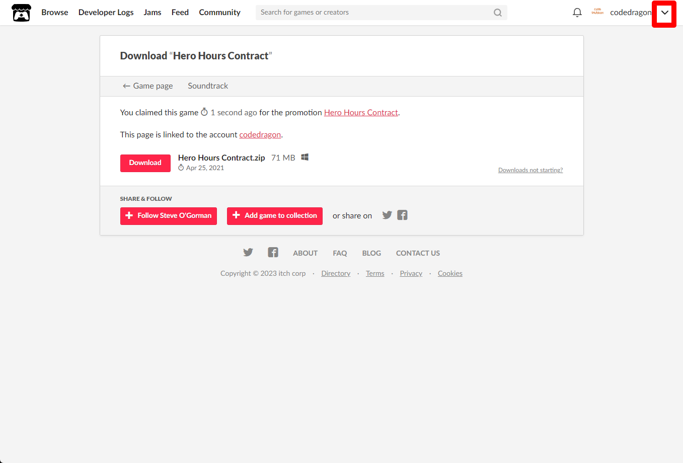 [Claim game]을 클릭하면 "Hero Hours Contract" 게임이 나의 게임 라이브러리에 추가되고 설치파일을 다운받을 수 있는 페이지로 이동됩니다.