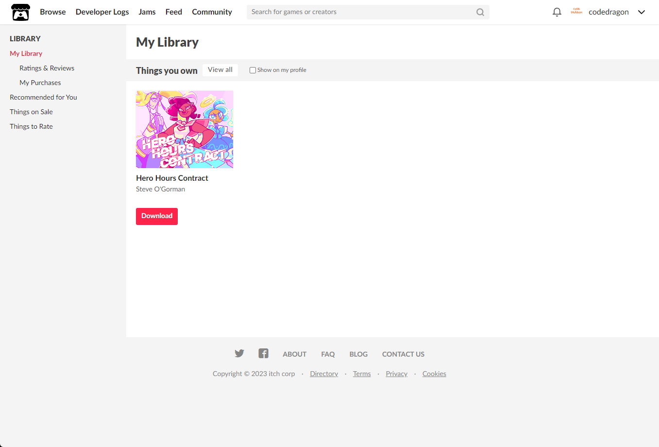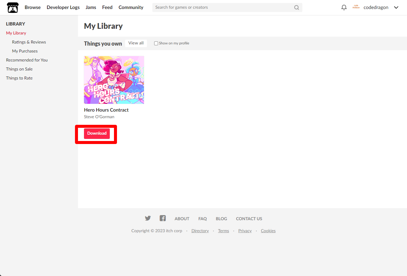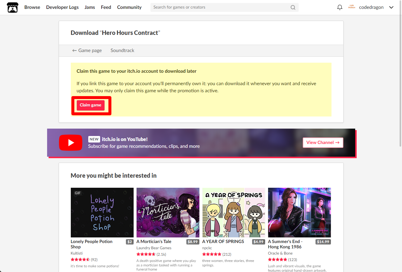[Claim game]을 클릭하면 "Hero Hours Contract" 게임이 나의 게임 라이브러리에 추가되고 설치파일을 다운받을 수 있는 페이지로 이동됩니다.