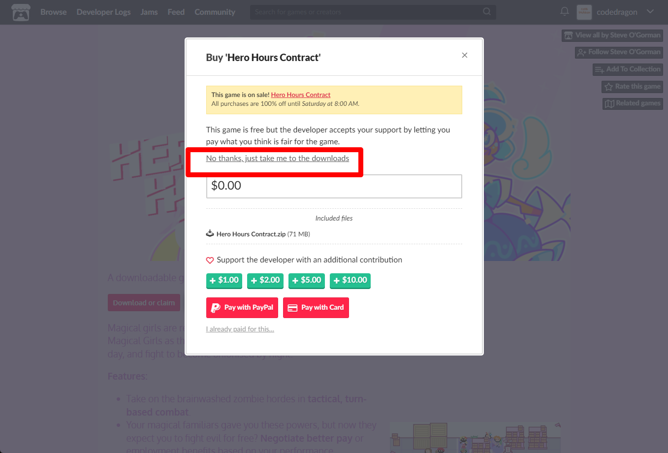 "Hero Hours Contract" 구매 팝업창에서 [No thanks, just take me to the downloads] 링크를 클릭합니다.