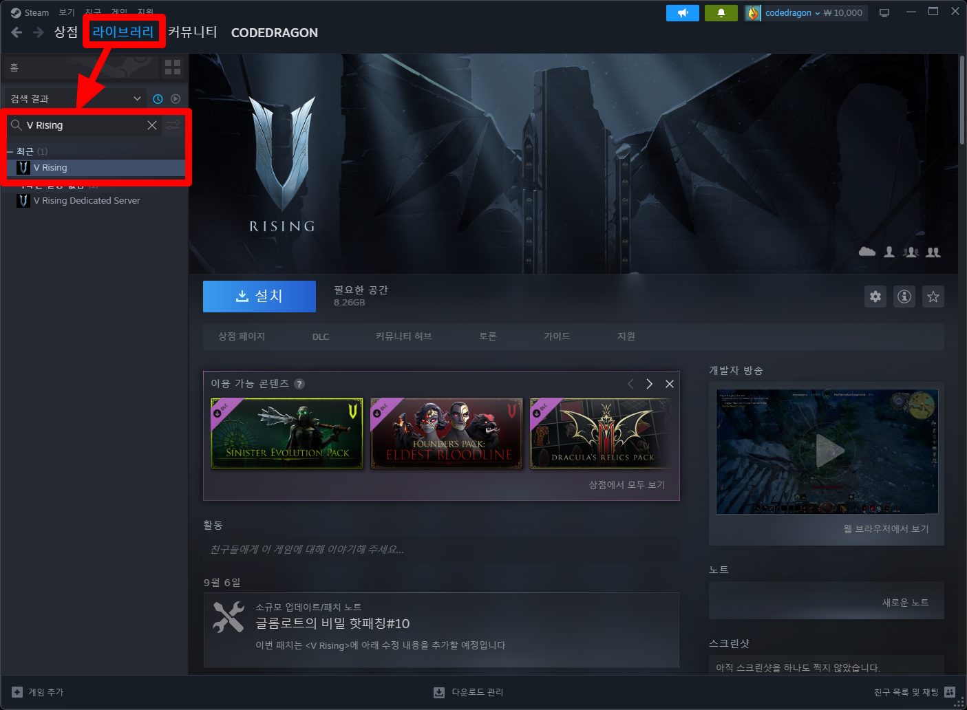 스팀 런처에서 상단에 있는 [라이브러리] 메뉴를 클릭합니다. 나의 게임 라이브러리에서 등록한 "V Rising" 항목을 확인할 수 있습니다