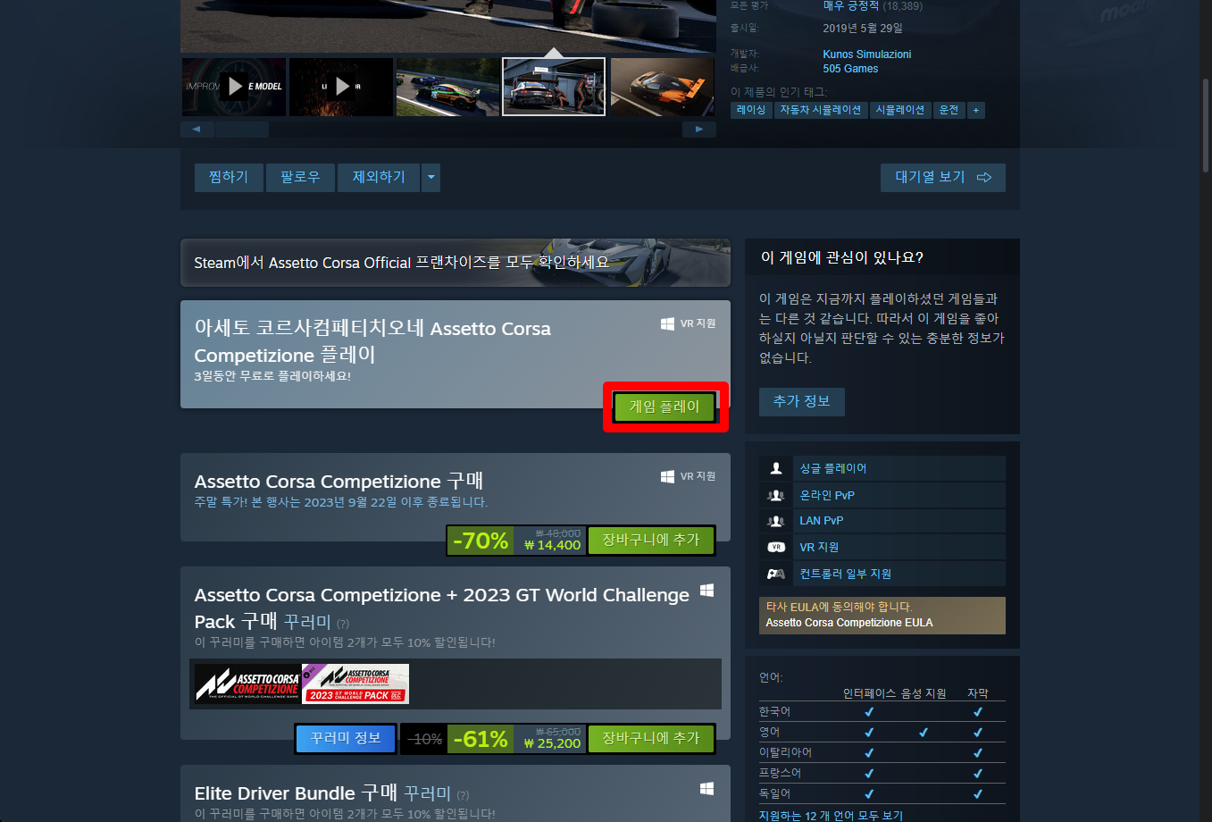 "Assetto Corsa Competizione" 게임페이지를 조금 내려서 [게임 플레이] 버튼을 클릭하면 됩니다.
